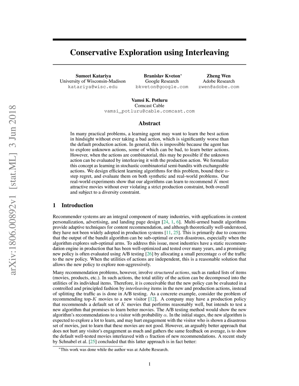 In many practical problems, a learning agent may want to learn the best action in hindsight without ever taking a bad action, which is significantly worse than the default production action. In general, this is impossible because the agent has to explore unknown actions, some of which can be bad, to learn better actions. However, when the actions are combinatorial, this may be possible if the unknown action can be evaluated by interleaving it with the production action. We formalize this concept as learning in stochastic combinatorial semi-bandits with exchangeable actions. We design efficient learning algorithms for this problem, bound their n-step regret, and evaluate them on both synthetic and real-world problems. Our real-world experiments show that our algorithms can learn to recommend K most attractive movies without ever violating a strict production constraint, both overall and subject to a diversity constraint.