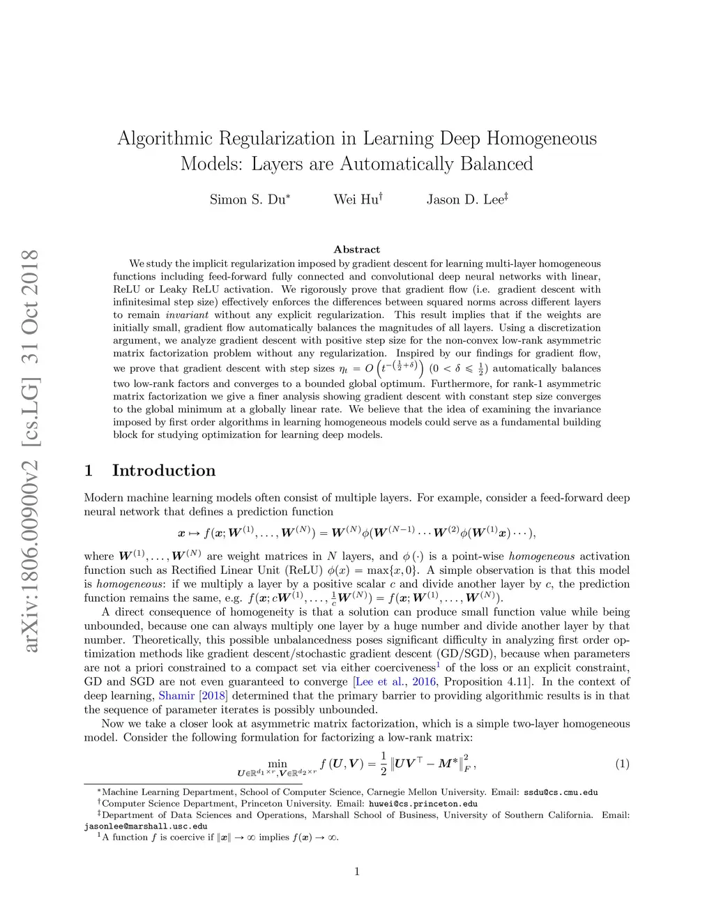 We study the implicit regularization imposed by gradient descent for learning multi-layer homogeneous functions including feed-forward fully connected and convolutional deep neural networks with linear, ReLU or Leaky ReLU activation. We rigorously prove that gradient flow (i.e. gradient descent with infinitesimal step size) effectively enforces the differences between squared norms across different layers to remain invariant without any explicit regularization. This result implies that if the weights are initially small, gradient flow automatically balances the magnitudes of all layers. Using a discretization argument, we analyze gradient descent with positive step size for the non-convex low-rank asymmetric matrix factorization problem without any regularization. Inspired by our findings for gradient flow, we prove that gradient descent with step sizes () automatically balances two low-rank factors and converges to a bounded global optimum. Furthermore, for rank- asymmetric matrix factorization we give a finer analysis showing gradient descent with constant step size converges to the global minimum at a globally linear rate. We believe that the idea of examining the invariance imposed by first order algorithms in learning homogeneous models could serve as a fundamental building block for studying optimization for learning deep models.