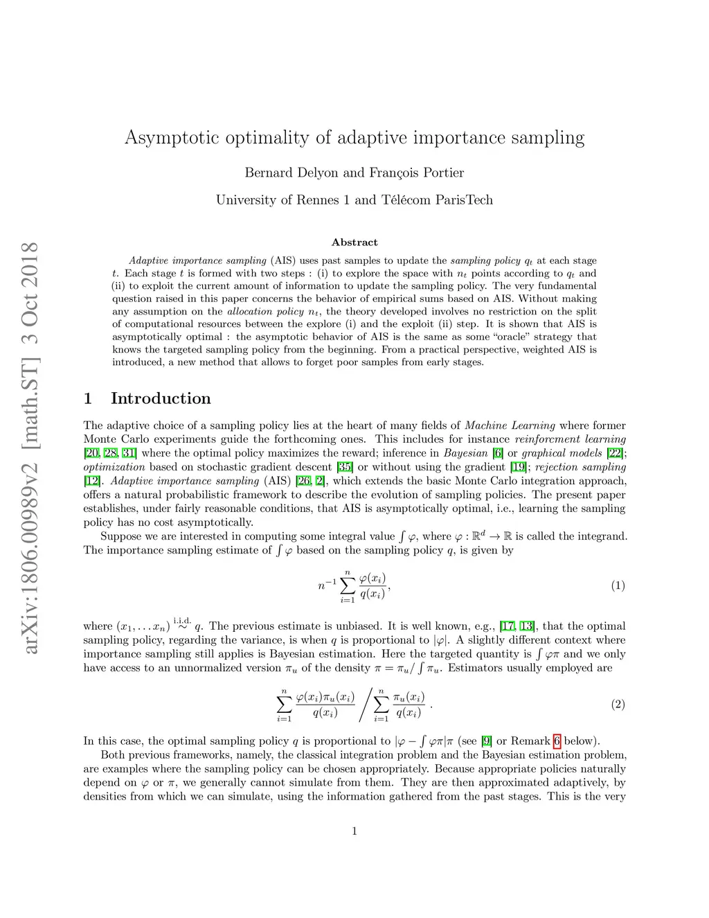 Adaptive importance sampling (AIS) uses past samples to update the \textit{sampling policy} at each stage . Each stage is formed with two steps : (i) to explore the space with points according to and (ii) to exploit the current amount of information to update the sampling policy. The very fundamental question raised in this paper concerns the behavior of empirical sums based on AIS. Without making any assumption on the allocation policy , the theory developed involves no restriction on the split of computational resources between the explore (i) and the exploit (ii) step. It is shown that AIS is asymptotically optimal : the asymptotic behavior of AIS is the same as some "oracle" strategy that knows the targeted sampling policy from the beginning. From a practical perspective, weighted AIS is introduced, a new method that allows to forget poor samples from early stages.
