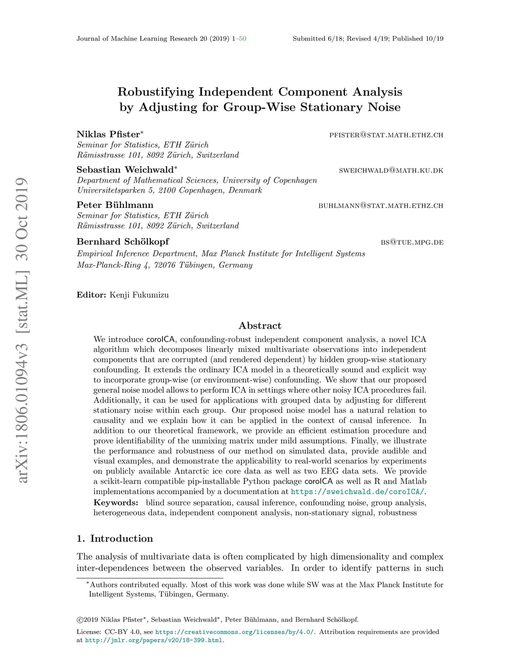 We introduce coroICA, confounding-robust independent component analysis, a novel ICA algorithm which decomposes linearly mixed multivariate observations into independent components that are corrupted (and rendered dependent) by hidden group-wise stationary confounding. It extends the ordinary ICA model in a theoretically sound and explicit way to incorporate group-wise (or environment-wise) confounding. We show that our proposed general noise model allows to perform ICA in settings where other noisy ICA procedures fail. Additionally, it can be used for applications with grouped data by adjusting for different stationary noise within each group. Our proposed noise model has a natural relation to causality and we explain how it can be applied in the context of causal inference. In addition to our theoretical framework, we provide an efficient estimation procedure and prove identifiability of the unmixing matrix under mild assumptions. Finally, we illustrate the performance and robustness of our method on simulated data, provide audible and visual examples, and demonstrate the applicability to real-world scenarios by experiments on publicly available Antarctic ice core data as well as two EEG data sets. We provide a scikit-learn compatible pip-installable Python package coroICA as well as R and Matlab implementations accompanied by a documentation at https://sweichwald.de/coroICA/