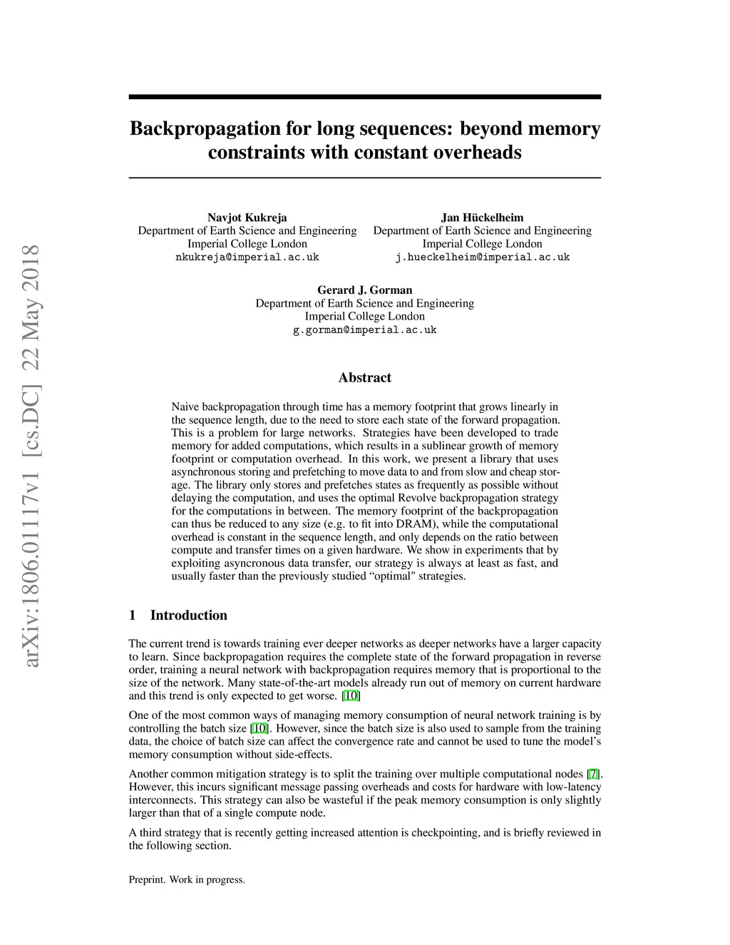 Naive backpropagation through time has a memory footprint that grows linearly in the sequence length, due to the need to store each state of the forward propagation. This is a problem for large networks. Strategies have been developed to trade memory for added computations, which results in a sublinear growth of memory footprint or computation overhead. In this work, we present a library that uses asynchronous storing and prefetching to move data to and from slow and cheap stor- age. The library only stores and prefetches states as frequently as possible without delaying the computation, and uses the optimal Revolve backpropagation strategy for the computations in between. The memory footprint of the backpropagation can thus be reduced to any size (e.g. to fit into DRAM), while the computational overhead is constant in the sequence length, and only depends on the ratio between compute and transfer times on a given hardware. We show in experiments that by exploiting asyncronous data transfer, our strategy is always at least as fast, and usually faster than the previously studied "optimal" strategies.