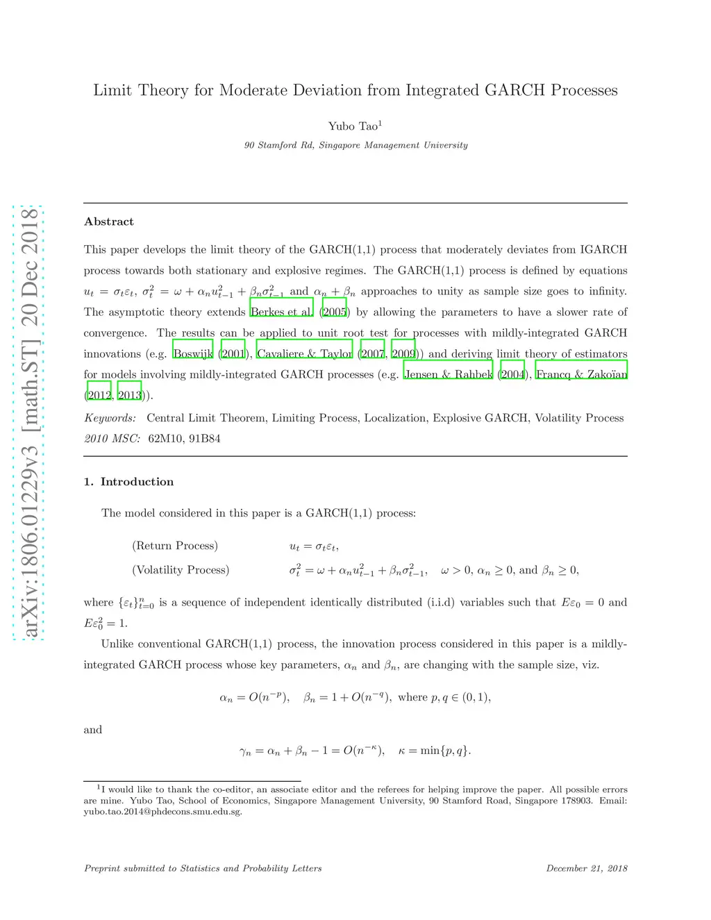 This paper develops the limit theory of the GARCH(1,1) process that moderately deviates from IGARCH process towards both stationary and explosive regimes. The GARCH(1,1) process is defined by equations , and approaches to unity as sample size goes to infinity. The asymptotic theory developed in this paper extends Berkes et al. (2005) by allowing the parameters to have a slower convergence rate. The results can be applied to unit root test for processes with mildly-integrated GARCH innovations (e.g. Boswijk (2001), Cavaliere and Taylor (2007, 2009)) and deriving limit theory of estimators for models involving mildly-integrated GARCH processes (e.g. Jensen and Rahbek (2004), Francq and Zako\"ian (2012, 2013)).