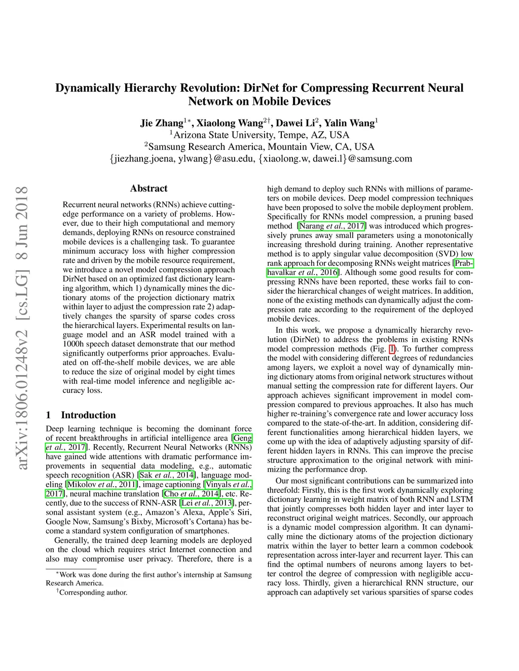 Recurrent neural networks (RNNs) achieve cutting-edge performance on a variety of problems. However, due to their high computational and memory demands, deploying RNNs on resource constrained mobile devices is a challenging task. To guarantee minimum accuracy loss with higher compression rate and driven by the mobile resource requirement, we introduce a novel model compression approach DirNet based on an optimized fast dictionary learning algorithm, which 1) dynamically mines the dictionary atoms of the projection dictionary matrix within layer to adjust the compression rate 2) adaptively changes the sparsity of sparse codes cross the hierarchical layers. Experimental results on language model and an ASR model trained with a 1000h speech dataset demonstrate that our method significantly outperforms prior approaches. Evaluated on off-the-shelf mobile devices, we are able to reduce the size of original model by eight times with real-time model inference and negligible accuracy loss.