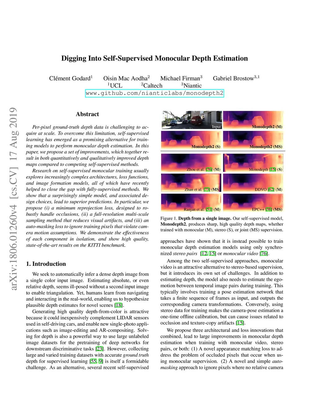 Per-pixel ground-truth depth data is challenging to acquire at scale. To overcome this limitation, self-supervised learning has emerged as a promising alternative for training models to perform monocular depth estimation. In this paper, we propose a set of improvements, which together result in both quantitatively and qualitatively improved depth maps compared to competing self-supervised methods. Research on self-supervised monocular training usually explores increasingly complex architectures, loss functions, and image formation models, all of which have recently helped to close the gap with fully-supervised methods. We show that a surprisingly simple model, and associated design choices, lead to superior predictions. In particular, we propose (i) a minimum reprojection loss, designed to robustly handle occlusions, (ii) a full-resolution multi-scale sampling method that reduces visual artifacts, and (iii) an auto-masking loss to ignore training pixels that violate camera motion assumptions. We demonstrate the effectiveness of each component in isolation, and show high quality, state-of-the-art results on the KITTI benchmark.