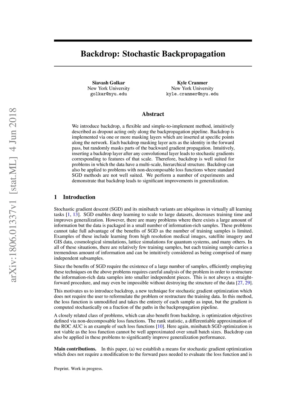 We introduce backdrop, a flexible and simple-to-implement method, intuitively described as dropout acting only along the backpropagation pipeline. Backdrop is implemented via one or more masking layers which are inserted at specific points along the network. Each backdrop masking layer acts as the identity in the forward pass, but randomly masks parts of the backward gradient propagation. Intuitively, inserting a backdrop layer after any convolutional layer leads to stochastic gradients corresponding to features of that scale. Therefore, backdrop is well suited for problems in which the data have a multi-scale, hierarchical structure. Backdrop can also be applied to problems with non-decomposable loss functions where standard SGD methods are not well suited. We perform a number of experiments and demonstrate that backdrop leads to significant improvements in generalization.