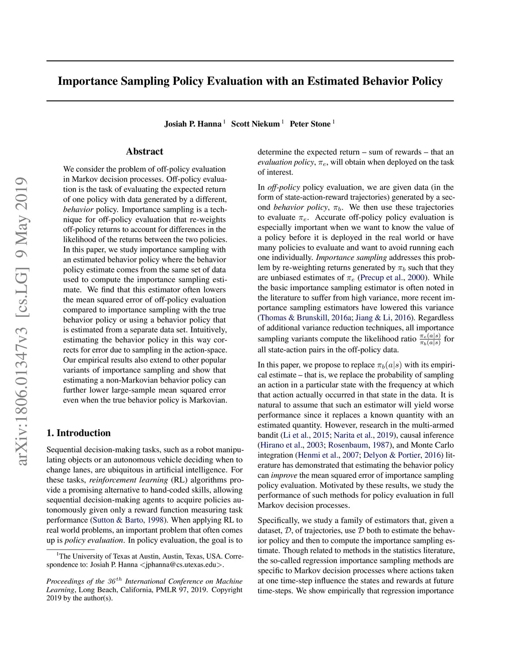 We consider the problem of off-policy evaluation in Markov decision processes. Off-policy evaluation is the task of evaluating the expected return of one policy with data generated by a different, behavior policy. Importance sampling is a technique for off-policy evaluation that re-weights off-policy returns to account for differences in the likelihood of the returns between the two policies. In this paper, we study importance sampling with an estimated behavior policy where the behavior policy estimate comes from the same set of data used to compute the importance sampling estimate. We find that this estimator often lowers the mean squared error of off-policy evaluation compared to importance sampling with the true behavior policy or using a behavior policy that is estimated from a separate data set. Intuitively, estimating the behavior policy in this way corrects for error due to sampling in the action-space. Our empirical results also extend to other popular variants of importance sampling and show that estimating a non-Markovian behavior policy can further lower large-sample mean squared error even when the true behavior policy is Markovian.