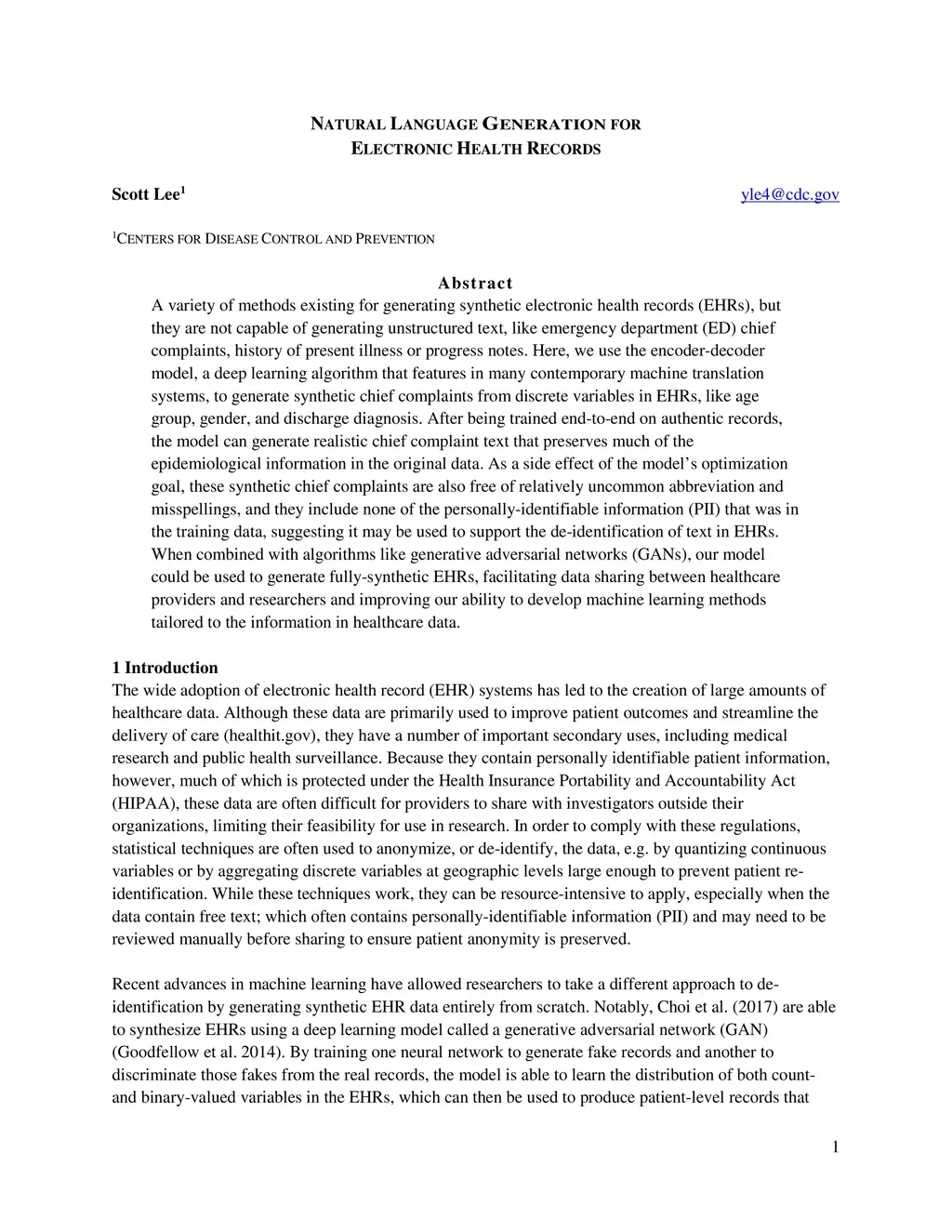 A variety of methods existing for generating synthetic electronic health records (EHRs), but they are not capable of generating unstructured text, like emergency department (ED) chief complaints, history of present illness or progress notes. Here, we use the encoder-decoder model, a deep learning algorithm that features in many contemporary machine translation systems, to generate synthetic chief complaints from discrete variables in EHRs, like age group, gender, and discharge diagnosis. After being trained end-to-end on authentic records, the model can generate realistic chief complaint text that preserves much of the epidemiological information in the original data. As a side effect of the model's optimization goal, these synthetic chief complaints are also free of relatively uncommon abbreviation and misspellings, and they include none of the personally-identifiable information (PII) that was in the training data, suggesting it may be used to support the de-identification of text in EHRs. When combined with algorithms like generative adversarial networks (GANs), our model could be used to generate fully-synthetic EHRs, facilitating data sharing between healthcare providers and researchers and improving our ability to develop machine learning methods tailored to the information in healthcare data.