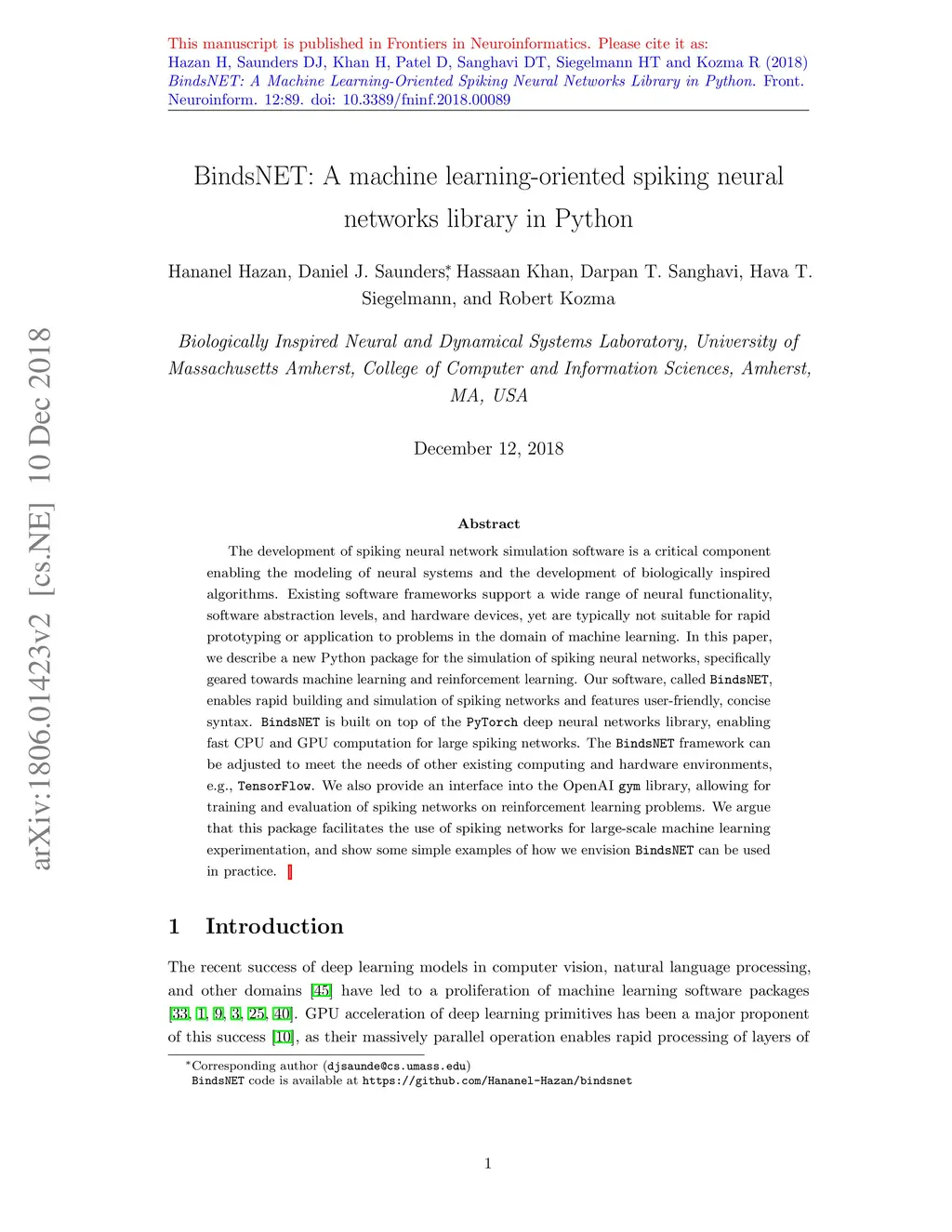 BindsNET: A machine learning-oriented spiking neural networks library in