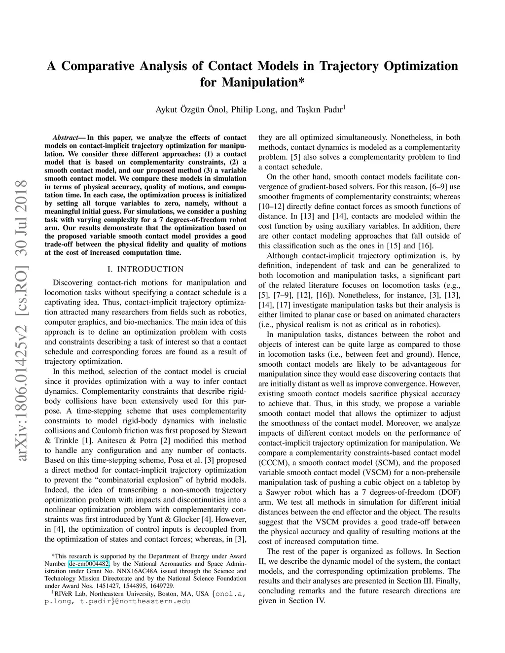 In this paper, we analyze the effects of contact models on contact-implicit trajectory optimization for manipulation. We consider three different approaches: (1) a contact model that is based on complementarity constraints, (2) a smooth contact model, and our proposed method (3) a variable smooth contact model. We compare these models in simulation in terms of physical accuracy, quality of motions, and computation time. In each case, the optimization process is initialized by setting all torque variables to zero, namely, without a meaningful initial guess. For simulations, we consider a pushing task with varying complexity for a 7 degrees-of-freedom robot arm. Our results demonstrate that the optimization based on the proposed variable smooth contact model provides a good trade-off between the physical fidelity and quality of motions at the cost of increased computation time.