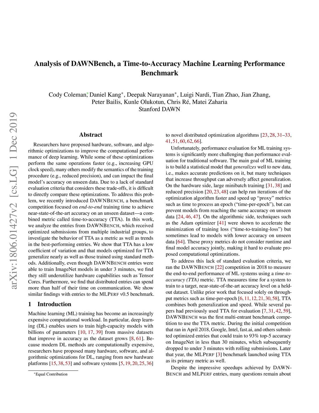 Researchers have proposed hardware, software, and algorithmic optimizations to improve the computational performance of deep learning. While some of these optimizations perform the same operations faster (e.g., increasing GPU clock speed), many others modify the semantics of the training procedure (e.g., reduced precision), and can impact the final model's accuracy on unseen data. Due to a lack of standard evaluation criteria that considers these trade-offs, it is difficult to directly compare these optimizations. To address this problem, we recently introduced DAWNBench, a benchmark competition focused on end-to-end training time to achieve near-state-of-the-art accuracy on an unseen dataset---a combined metric called time-to-accuracy (TTA). In this work, we analyze the entries from DAWNBench, which received optimized submissions from multiple industrial groups, to investigate the behavior of TTA as a metric as well as trends in the best-performing entries. We show that TTA has a low coefficient of variation and that models optimized for TTA generalize nearly as well as those trained using standard methods. Additionally, even though DAWNBench entries were able to train ImageNet models in under 3 minutes, we find they still underutilize hardware capabilities such as Tensor Cores. Furthermore, we find that distributed entries can spend more than half of their time on communication. We show similar findings with entries to the MLPERF v0.5 benchmark.