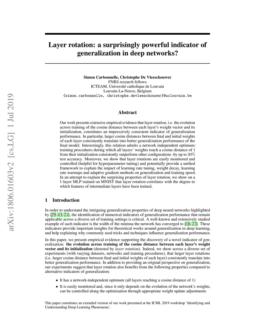 Our work presents extensive empirical evidence that layer rotation, i.e. the evolution across training of the cosine distance between each layer's weight vector and its initialization, constitutes an impressively consistent indicator of generalization performance. In particular, larger cosine distances between final and initial weights of each layer consistently translate into better generalization performance of the final model. Interestingly, this relation admits a network independent optimum: training procedures during which all layers' weights reach a cosine distance of 1 from their initialization consistently outperform other configurations -by up to 30% test accuracy. Moreover, we show that layer rotations are easily monitored and controlled (helpful for hyperparameter tuning) and potentially provide a unified framework to explain the impact of learning rate tuning, weight decay, learning rate warmups and adaptive gradient methods on generalization and training speed. In an attempt to explain the surprising properties of layer rotation, we show on a 1-layer MLP trained on MNIST that layer rotation correlates with the degree to which features of intermediate layers have been trained.