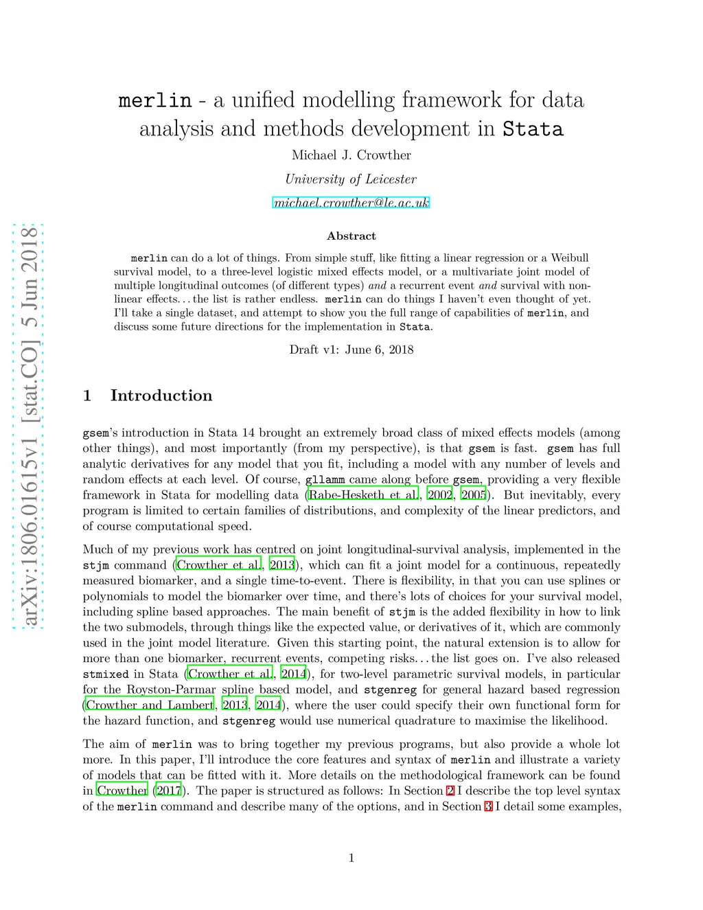 merlin can do a lot of things. From simple stuff, like fitting a linear regression or a Weibull survival model, to a three-level logistic mixed effects model, or a multivariate joint model of multiple longitudinal outcomes (of different types) and a recurrent event and survival with non-linear effects...the list is rather endless. merlin can do things I haven't even thought of yet. I'll take a single dataset, and attempt to show you the full range of capabilities of merlin, and discuss some future directions for the implementation in Stata.