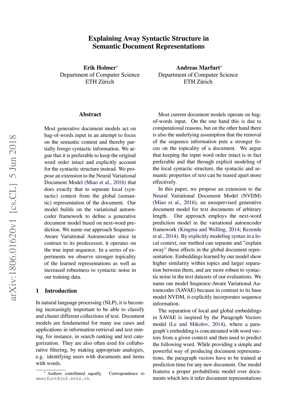 Most generative document models act on bag-of-words input in an attempt to focus on the semantic content and thereby partially forego syntactic information. We argue that it is preferable to keep the original word order intact and explicitly account for the syntactic structure instead. We propose an extension to the Neural Variational Document Model (Miao et al., 2016) that does exactly that to separate local (syntactic) context from the global (semantic) representation of the document. Our model builds on the variational autoencoder framework to define a generative document model based on next-word prediction. We name our approach Sequence-Aware Variational Autoencoder since in contrast to its predecessor, it operates on the true input sequence. In a series of experiments we observe stronger topicality of the learned representations as well as increased robustness to syntactic noise in our training data.