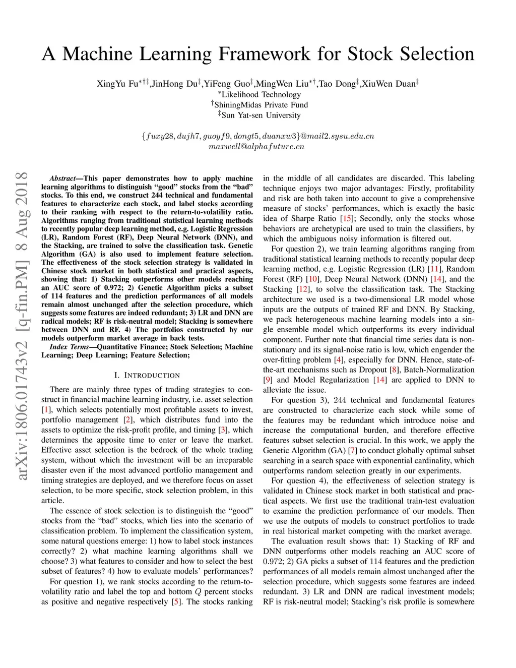 This paper demonstrates how to apply machine learning algorithms to distinguish good stocks from the bad stocks. To this end, we construct 244 technical and fundamental features to characterize each stock, and label stocks according to their ranking with respect to the return-to-volatility ratio. Algorithms ranging from traditional statistical learning methods to recently popular deep learning method, e.g. Logistic Regression (LR), Random Forest (RF), Deep Neural Network (DNN), and the Stacking, are trained to solve the classification task. Genetic Algorithm (GA) is also used to implement feature selection. The effectiveness of the stock selection strategy is validated in Chinese stock market in both statistical and practical aspects, showing that: 1) Stacking outperforms other models reaching an AUC score of 0.972; 2) Genetic Algorithm picks a subset of 114 features and the prediction performances of all models remain almost unchanged after the selection procedure, which suggests some features are indeed redundant; 3) LR and DNN are radical models; RF is risk-neutral model; Stacking is somewhere between DNN and RF. 4) The portfolios constructed by our models outperform market average in back tests.