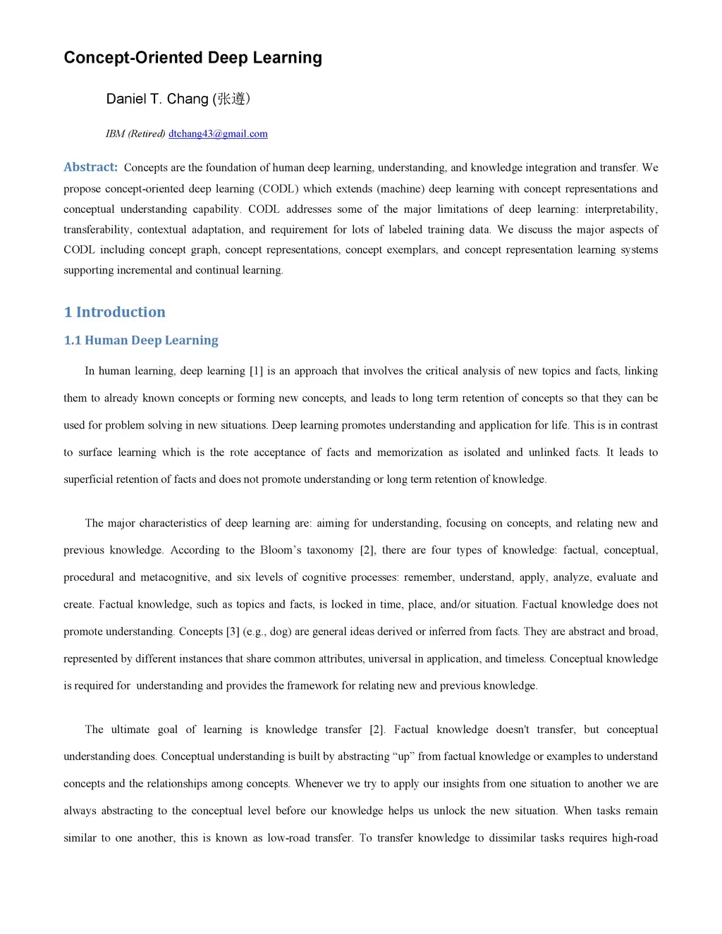 Concepts are the foundation of human deep learning, understanding, and knowledge integration and transfer. We propose concept-oriented deep learning (CODL) which extends (machine) deep learning with concept representations and conceptual understanding capability. CODL addresses some of the major limitations of deep learning: interpretability, transferability, contextual adaptation, and requirement for lots of labeled training data. We discuss the major aspects of CODL including concept graph, concept representations, concept exemplars, and concept representation learning systems supporting incremental and continual learning.