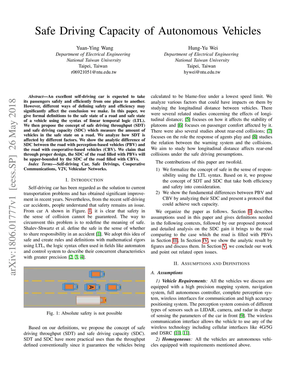 An excellent self-driving car is expected to take its passengers safely and efficiently from one place to another. However, different ways of defining safety and efficiency may significantly affect the conclusion we make. In this paper, we give formal definitions to the safe state of a road and safe state of a vehicle using the syntax of linear temporal logic (LTL). We then propose the concept of safe driving throughput (SDT) and safe driving capacity (SDC) which measure the amount of vehicles in the safe state on a road. We analyze how SDT is affected by different factors. We show the analytic difference of SDC between the road with perception-based vehicles (PBV) and the road with cooperative-based vehicles (CBV). We claim that through proper design, the SDC of the road filled with PBVs will be upper-bounded by the SDC of the road filled with CBVs.