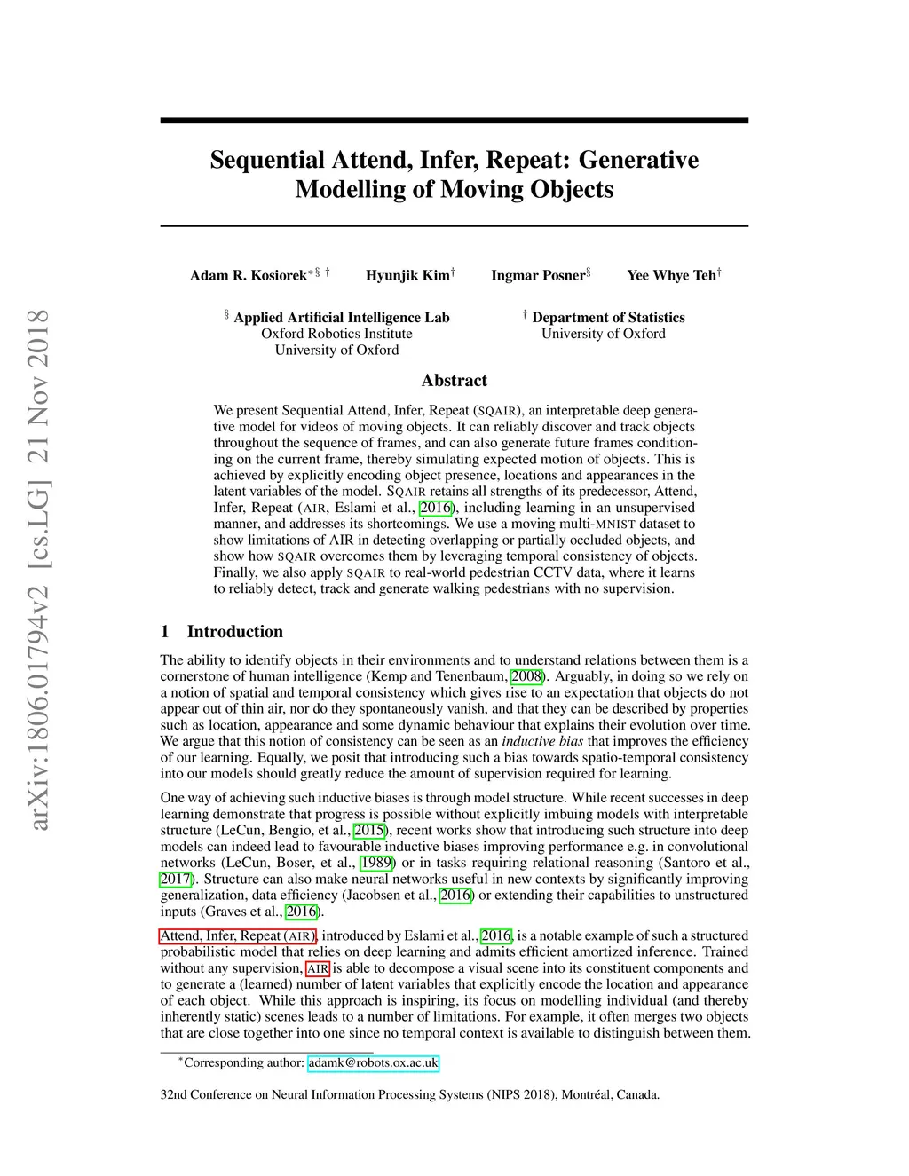 Sequential Attend, Infer, Repeat: Generative Modelling of Moving Objects