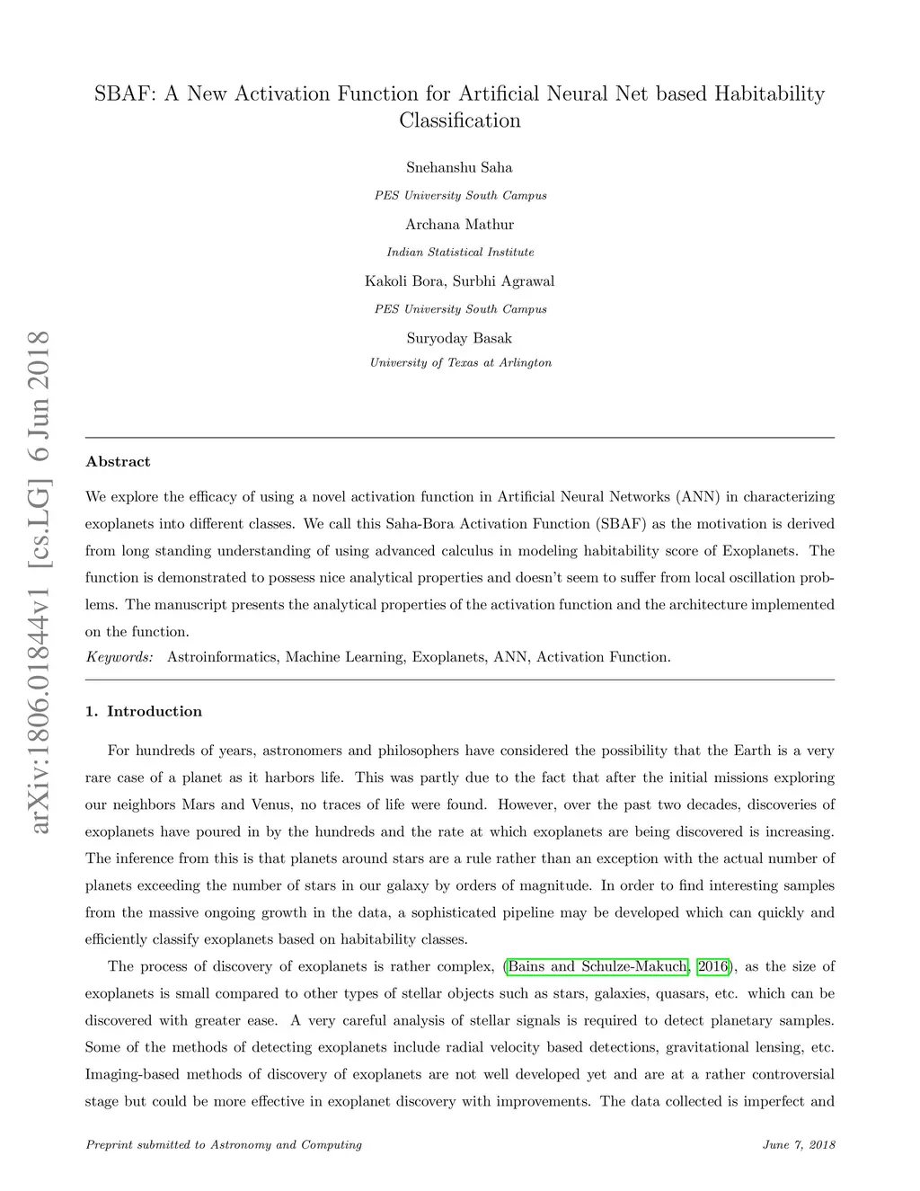 We explore the efficacy of using a novel activation function in Artificial Neural Networks (ANN) in characterizing exoplanets into different classes. We call this Saha-Bora Activation Function (SBAF) as the motivation is derived from long standing understanding of using advanced calculus in modeling habitability score of Exoplanets. The function is demonstrated to possess nice analytical properties and doesn't seem to suffer from local oscillation problems. The manuscript presents the analytical properties of the activation function and the architecture implemented on the function. Keywords: Astroinformatics, Machine Learning, Exoplanets, ANN, Activation Function.