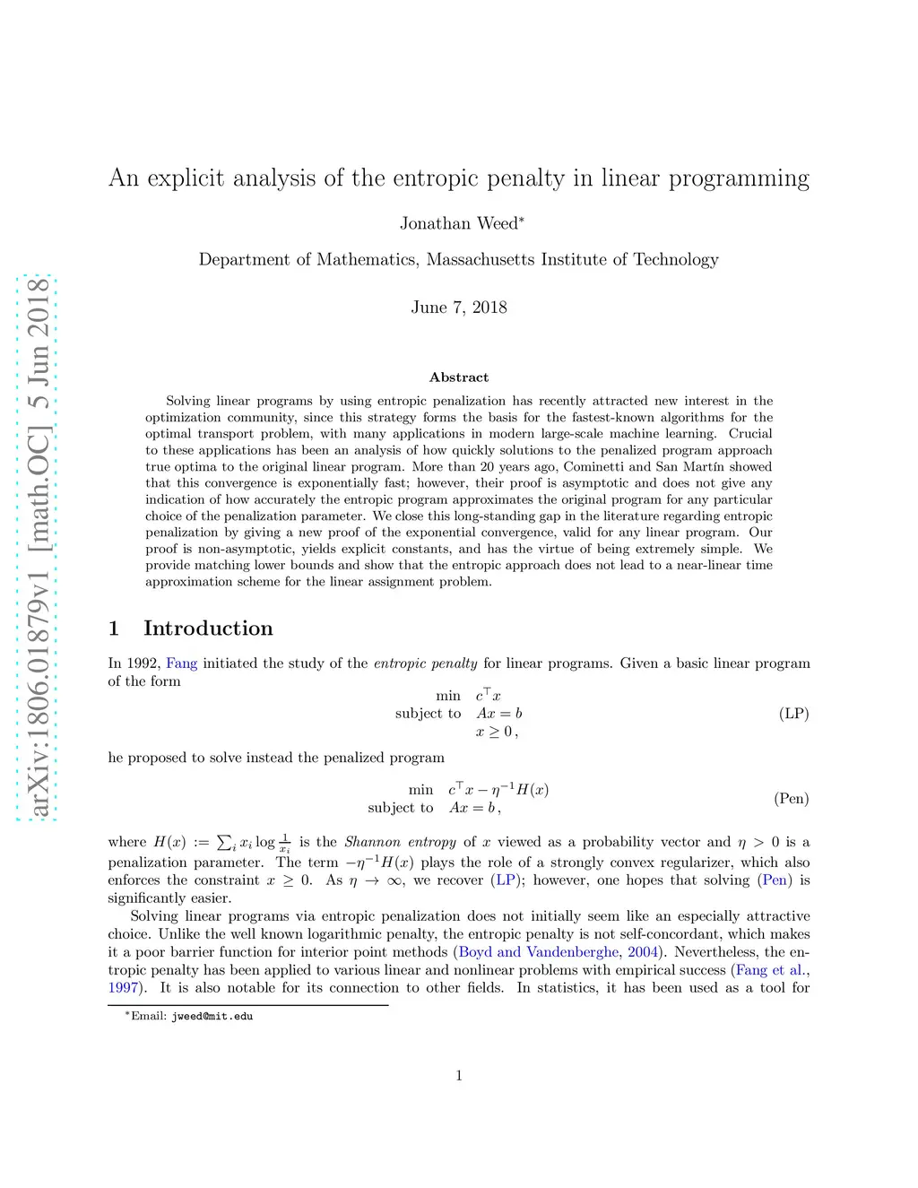 Solving linear programs by using entropic penalization has recently attracted new interest in the optimization community, since this strategy forms the basis for the fastest-known algorithms for the optimal transport problem, with many applications in modern large-scale machine learning. Crucial to these applications has been an analysis of how quickly solutions to the penalized program approach true optima to the original linear program. More than 20 years ago, Cominetti and San Mart\ín showed that this convergence is exponentially fast; however, their proof is asymptotic and does not give any indication of how accurately the entropic program approximates the original program for any particular choice of the penalization parameter. We close this long-standing gap in the literature regarding entropic penalization by giving a new proof of the exponential convergence, valid for any linear program. Our proof is non-asymptotic, yields explicit constants, and has the virtue of being extremely simple. We provide matching lower bounds and show that the entropic approach does not lead to a near-linear time approximation scheme for the linear assignment problem.