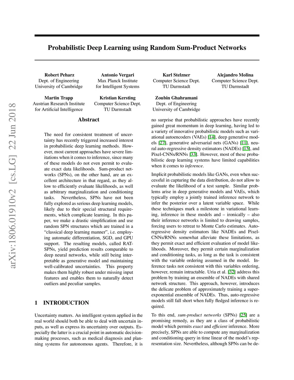 The need for consistent treatment of uncertainty has recently triggered increased interest in probabilistic deep learning methods. However, most current approaches have severe limitations when it comes to inference, since many of these models do not even permit to evaluate exact data likelihoods. Sum-product networks (SPNs), on the other hand, are an excellent architecture in that regard, as they allow to efficiently evaluate likelihoods, as well as arbitrary marginalization and conditioning tasks. Nevertheless, SPNs have not been fully explored as serious deep learning models, likely due to their special structural requirements, which complicate learning. In this paper, we make a drastic simplification and use random SPN structures which are trained in a "classical deep learning manner", i.e. employing automatic differentiation, SGD, and GPU support. The resulting models, called RAT-SPNs, yield prediction results comparable to deep neural networks, while still being interpretable as generative model and maintaining well-calibrated uncertainties. This property makes them highly robust under missing input features and enables them to naturally detect outliers and peculiar samples.