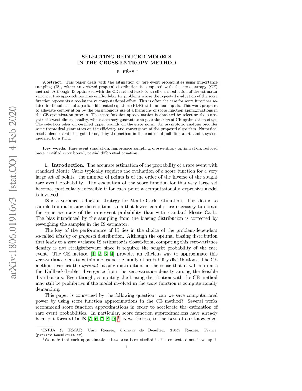 This paper deals with the estimation of rare event probabilities using importance sampling (IS), where an optimal proposal distribution is computed with the cross-entropy (CE) method. Although, IS optimized with the CE method leads to an efficient reduction of the estimator variance, this approach remains unaffordable for problems where the repeated evaluation of the score function represents a too intensive computational effort. This is often the case for score functions related to the solution of a partial differential equation (PDE) with random inputs. This work proposes to alleviate computation by the parsimonious use of a hierarchy of score function approximations in the CE optimization process. The score function approximation is obtained by selecting the surrogate of lowest dimensionality, whose accuracy guarantees to pass the current CE optimization stage. The selection relies on certified upper bounds on the error norm. An asymptotic analysis provides some theoretical guarantees on the efficiency and convergence of the proposed algorithm. Numerical results demonstrate the gain brought by the method in the context of pollution alerts and a system modeled by a PDE.