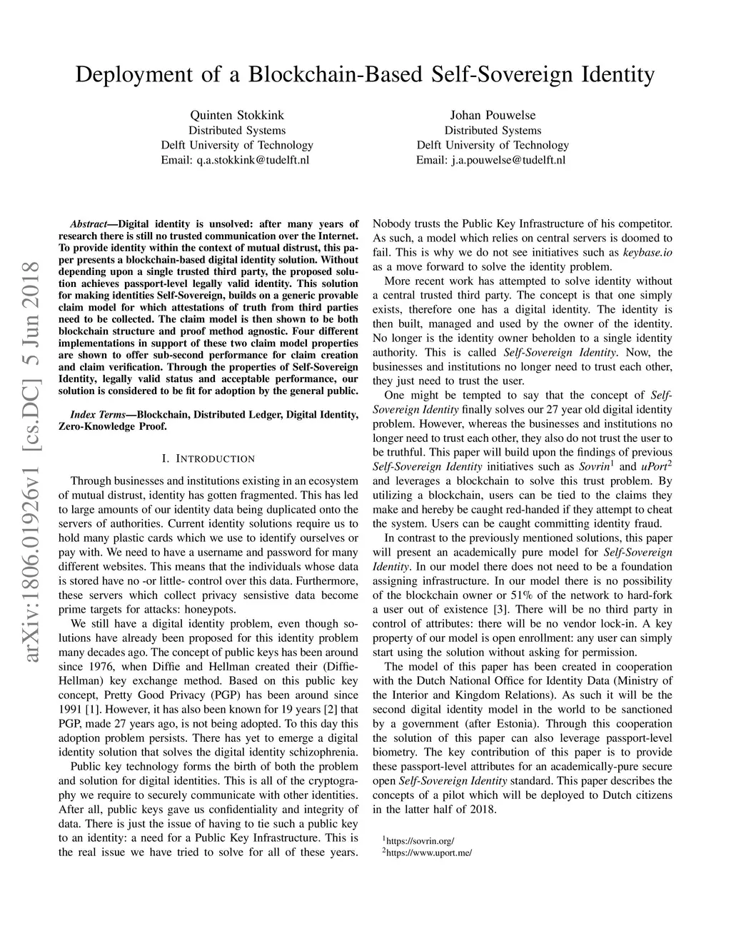 Digital identity is unsolved: after many years of research there is still no trusted communication over the Internet. To provide identity within the context of mutual distrust, this paper presents a blockchain-based digital identity solution. Without depending upon a single trusted third party, the proposed solution achieves passport-level legally valid identity. This solution for making identities Self-Sovereign, builds on a generic provable claim model for which attestations of truth from third parties need to be collected. The claim model is then shown to be both blockchain structure and proof method agnostic. Four different implementations in support of these two claim model properties are shown to offer sub-second performance for claim creation and claim verification. Through the properties of Self-Sovereign Identity, legally valid status and acceptable performance, our solution is considered to be fit for adoption by the general public.