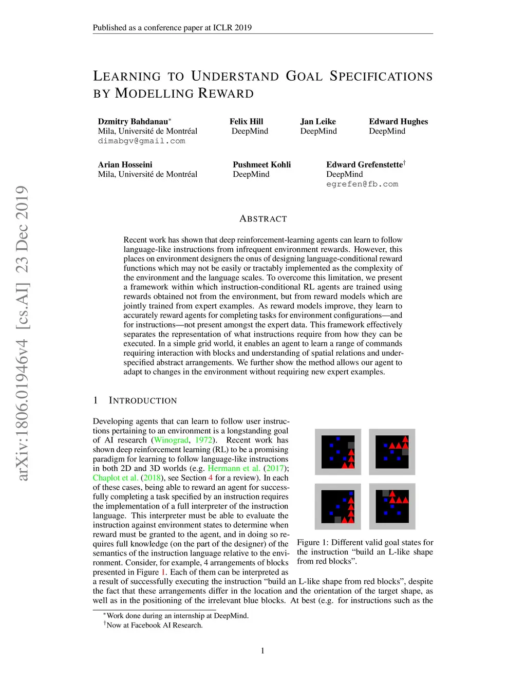Recent work has shown that deep reinforcement-learning agents can learn to follow language-like instructions from infrequent environment rewards. However, this places on environment designers the onus of designing language-conditional reward functions which may not be easily or tractably implemented as the complexity of the environment and the language scales. To overcome this limitation, we present a framework within which instruction-conditional RL agents are trained using rewards obtained not from the environment, but from reward models which are jointly trained from expert examples. As reward models improve, they learn to accurately reward agents for completing tasks for environment configurations---and for instructions---not present amongst the expert data. This framework effectively separates the representation of what instructions require from how they can be executed. In a simple grid world, it enables an agent to learn a range of commands requiring interaction with blocks and understanding of spatial relations and underspecified abstract arrangements. We further show the method allows our agent to adapt to changes in the environment without requiring new expert examples.