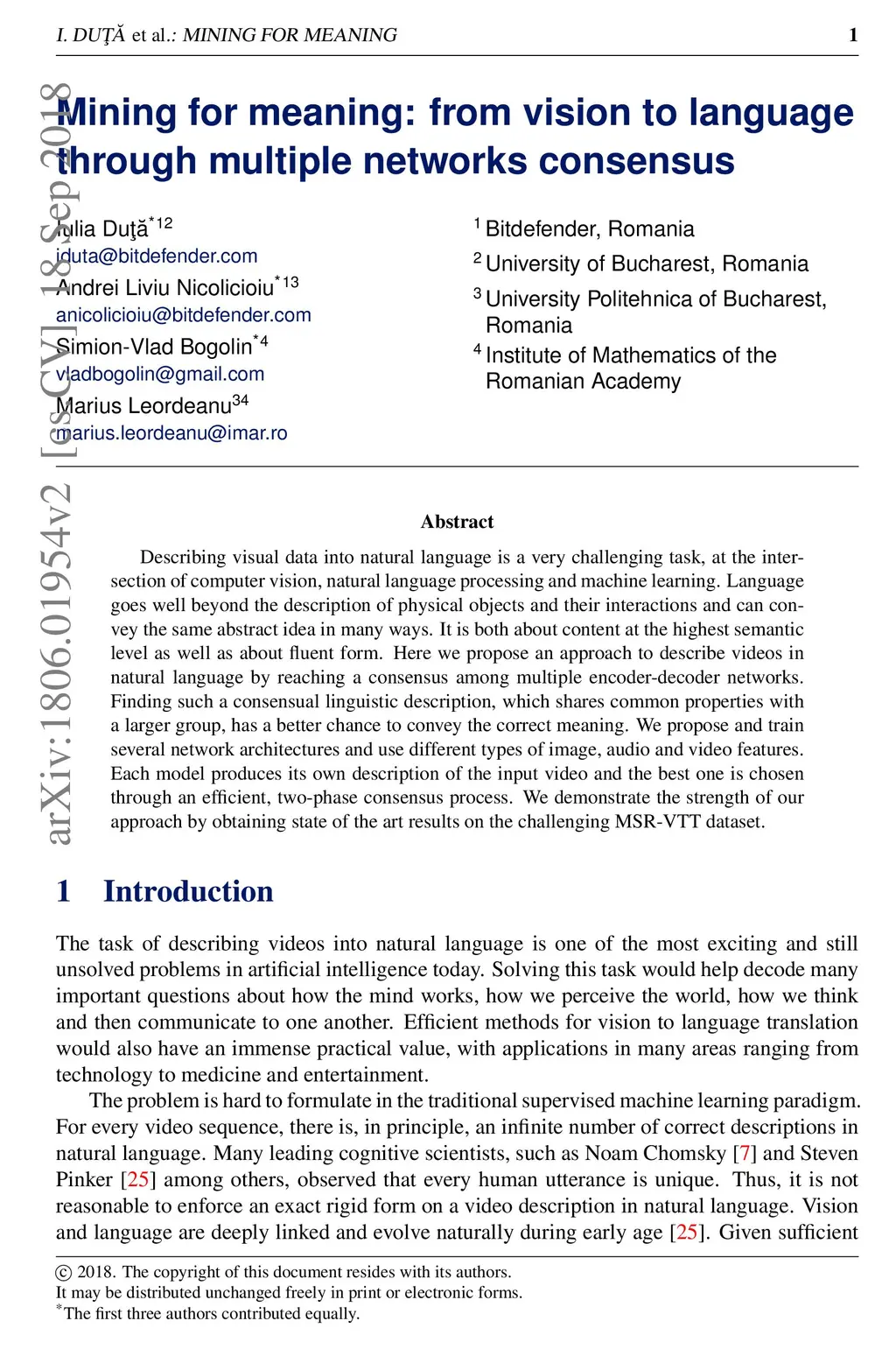 Describing visual data into natural language is a very challenging task, at the intersection of computer vision, natural language processing and machine learning. Language goes well beyond the description of physical objects and their interactions and can convey the same abstract idea in many ways. It is both about content at the highest semantic level as well as about fluent form. Here we propose an approach to describe videos in natural language by reaching a consensus among multiple encoder-decoder networks. Finding such a consensual linguistic description, which shares common properties with a larger group, has a better chance to convey the correct meaning. We propose and train several network architectures and use different types of image, audio and video features. Each model produces its own description of the input video and the best one is chosen through an efficient, two-phase consensus process. We demonstrate the strength of our approach by obtaining state of the art results on the challenging MSR-VTT dataset.