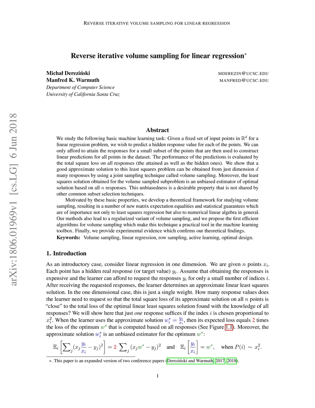 We study the following basic machine learning task: Given a fixed set of -dimensional input points for a linear regression problem, we wish to predict a hidden response value for each of the points. We can only afford to attain the responses for a small subset of the points that are then used to construct linear predictions for all points in the dataset. The performance of the predictions is evaluated by the total square loss on all responses (the attained as well as the hidden ones). We show that a good approximate solution to this least squares problem can be obtained from just dimension many responses by using a joint sampling technique called volume sampling. Moreover, the least squares solution obtained for the volume sampled subproblem is an unbiased estimator of optimal solution based on all n responses. This unbiasedness is a desirable property that is not shared by other common subset selection techniques. Motivated by these basic properties, we develop a theoretical framework for studying volume sampling, resulting in a number of new matrix expectation equalities and statistical guarantees which are of importance not only to least squares regression but also to numerical linear algebra in general. Our methods also lead to a regularized variant of volume sampling, and we propose the first efficient algorithms for volume sampling which make this technique a practical tool in the machine learning toolbox. Finally, we provide experimental evidence which confirms our theoretical findings.