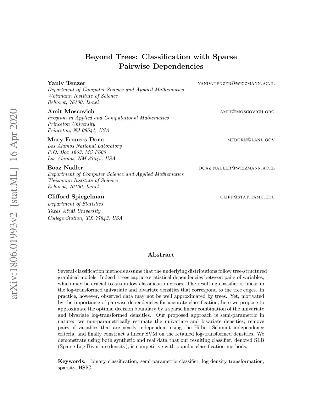 Several classification methods assume that the underlying distributions follow tree-structured graphical models. Indeed, trees capture statistical dependencies between pairs of variables, which may be crucial to attain low classification errors. The resulting classifier is linear in the log-transformed univariate and bivariate densities that correspond to the tree edges. In practice, however, observed data may not be well approximated by trees. Yet, motivated by the importance of pairwise dependencies for accurate classification, here we propose to approximate the optimal decision boundary by a sparse linear combination of the univariate and bivariate log-transformed densities. Our proposed approach is semi-parametric in nature: we non-parametrically estimate the univariate and bivariate densities, remove pairs of variables that are nearly independent using the Hilbert-Schmidt independence criteria, and finally construct a linear SVM on the retained log-transformed densities. We demonstrate using both synthetic and real data that our resulting classifier, denoted SLB (Sparse Log-Bivariate density), is competitive with popular classification methods.