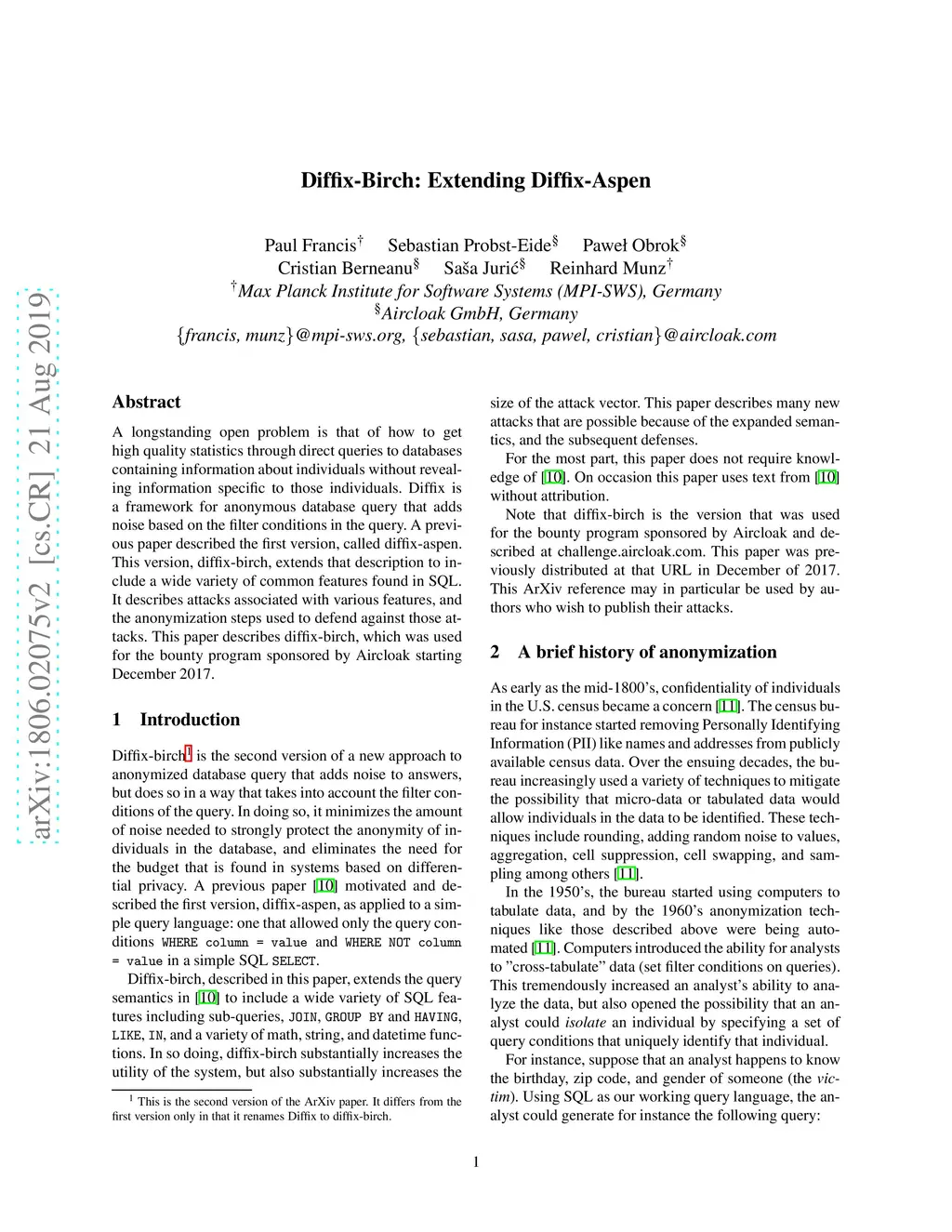 A longstanding open problem is that of how to get high quality statistics through direct queries to databases containing information about individuals without revealing information specific to those individuals. Diffix is a framework for anonymous database query that adds noise based on the filter conditions in the query. A previous paper described the first version, called diffix-aspen. This version, diffix-birch, extends that description to include a wide variety of common features found in SQL. It describes attacks associated with various features, and the anonymization steps used to defend against those attacks. This paper describes diffix-birch, which was used for the bounty program sponsored by Aircloak starting December 2017.