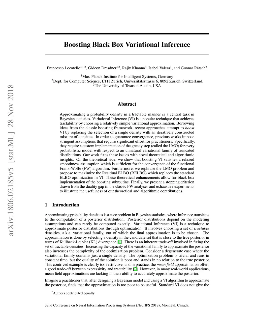 Approximating a probability density in a tractable manner is a central task in Bayesian statistics. Variational Inference (VI) is a popular technique that achieves tractability by choosing a relatively simple variational family. Borrowing ideas from the classic boosting framework, recent approaches attempt to \emph{boost} VI by replacing the selection of a single density with a greedily constructed mixture of densities. In order to guarantee convergence, previous works impose stringent assumptions that require significant effort for practitioners. Specifically, they require a custom implementation of the greedy step (called the LMO) for every probabilistic model with respect to an unnatural variational family of truncated distributions. Our work fixes these issues with novel theoretical and algorithmic insights. On the theoretical side, we show that boosting VI satisfies a relaxed smoothness assumption which is sufficient for the convergence of the functional Frank-Wolfe (FW) algorithm. Furthermore, we rephrase the LMO problem and propose to maximize the Residual ELBO (RELBO) which replaces the standard ELBO optimization in VI. These theoretical enhancements allow for black box implementation of the boosting subroutine. Finally, we present a stopping criterion drawn from the duality gap in the classic FW analyses and exhaustive experiments to illustrate the usefulness of our theoretical and algorithmic contributions.