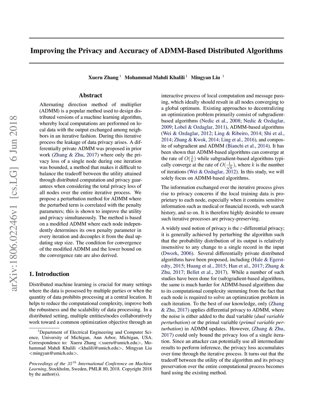 Alternating direction method of multiplier (ADMM) is a popular method used to design distributed versions of a machine learning algorithm, whereby local computations are performed on local data with the output exchanged among neighbors in an iterative fashion. During this iterative process the leakage of data privacy arises. A differentially private ADMM was proposed in prior work (Zhang & Zhu, 2017) where only the privacy loss of a single node during one iteration was bounded, a method that makes it difficult to balance the tradeoff between the utility attained through distributed computation and privacy guarantees when considering the total privacy loss of all nodes over the entire iterative process. We propose a perturbation method for ADMM where the perturbed term is correlated with the penalty parameters; this is shown to improve the utility and privacy simultaneously. The method is based on a modified ADMM where each node independently determines its own penalty parameter in every iteration and decouples it from the dual updating step size. The condition for convergence of the modified ADMM and the lower bound on the convergence rate are also derived.