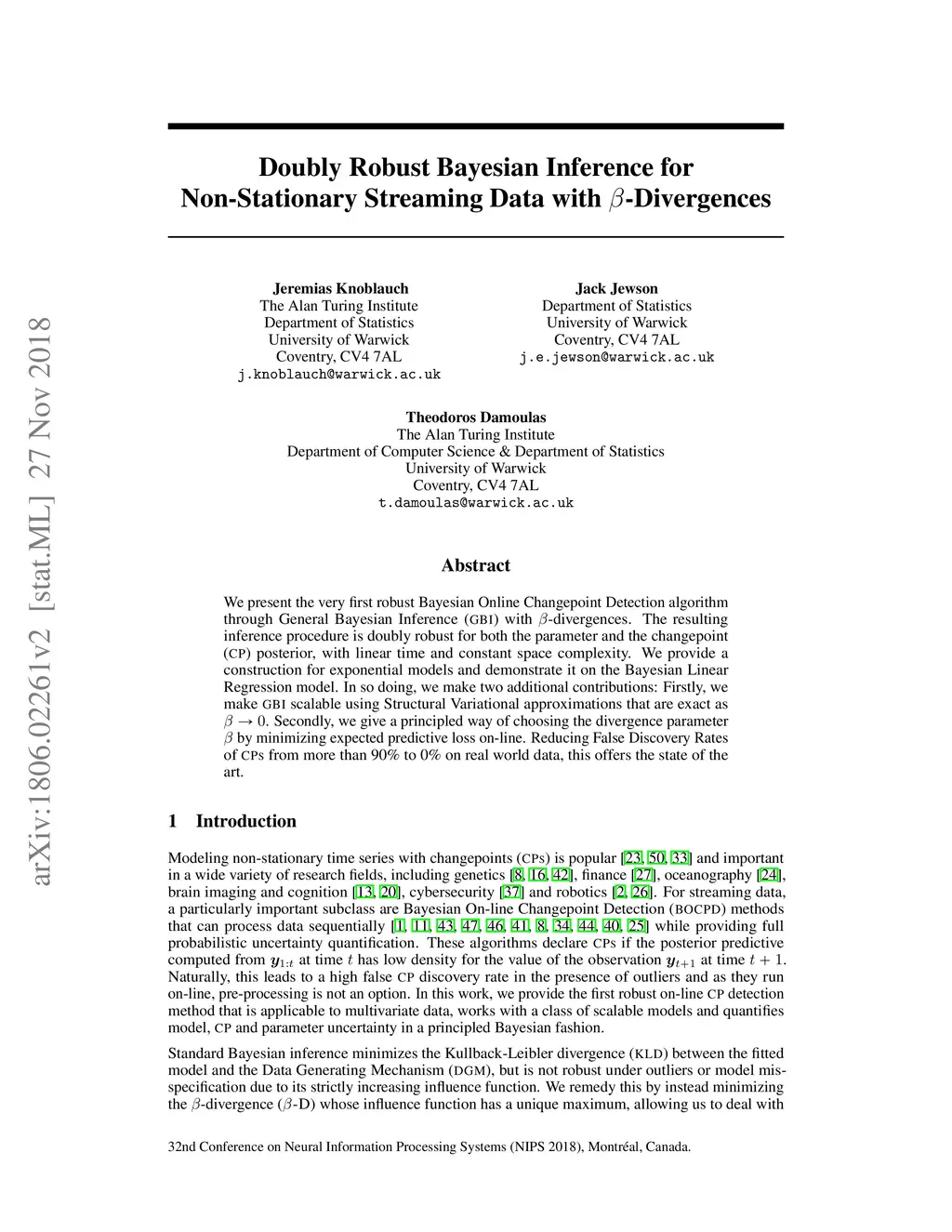 We present the very first robust Bayesian Online Changepoint Detection algorithm through General Bayesian Inference (GBI) with -divergences. The resulting inference procedure is doubly robust for both the parameter and the changepoint (CP) posterior, with linear time and constant space complexity. We provide a construction for exponential models and demonstrate it on the Bayesian Linear Regression model. In so doing, we make two additional contributions: Firstly, we make GBI scalable using Structural Variational approximations that are exact as . Secondly, we give a principled way of choosing the divergence parameter by minimizing expected predictive loss on-line. Reducing False Discovery Rates of CPs from more than 90% to 0% on real world data, this offers the state of the art.