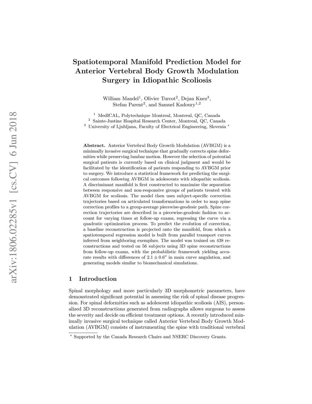 Anterior Vertebral Body Growth Modulation (AVBGM) is a minimally invasive surgical technique that gradually corrects spine deformities while preserving lumbar motion. However the selection of potential surgical patients is currently based on clinical judgment and would be facilitated by the identification of patients responding to AVBGM prior to surgery. We introduce a statistical framework for predicting the surgical outcomes following AVBGM in adolescents with idiopathic scoliosis. A discriminant manifold is first constructed to maximize the separation between responsive and non-responsive groups of patients treated with AVBGM for scoliosis. The model then uses subject-specific correction trajectories based on articulated transformations in order to map spine correction profiles to a group-average piecewise-geodesic path. Spine correction trajectories are described in a piecewise-geodesic fashion to account for varying times at follow-up exams, regressing the curve via a quadratic optimization process. To predict the evolution of correction, a baseline reconstruction is projected onto the manifold, from which a spatiotemporal regression model is built from parallel transport curves inferred from neighboring exemplars. The model was trained on 438 reconstructions and tested on 56 subjects using 3D spine reconstructions from follow-up exams, with the probabilistic framework yielding accurate results with differences of 2.1 +/- 0.6deg in main curve angulation, and generating models similar to biomechanical simulations.