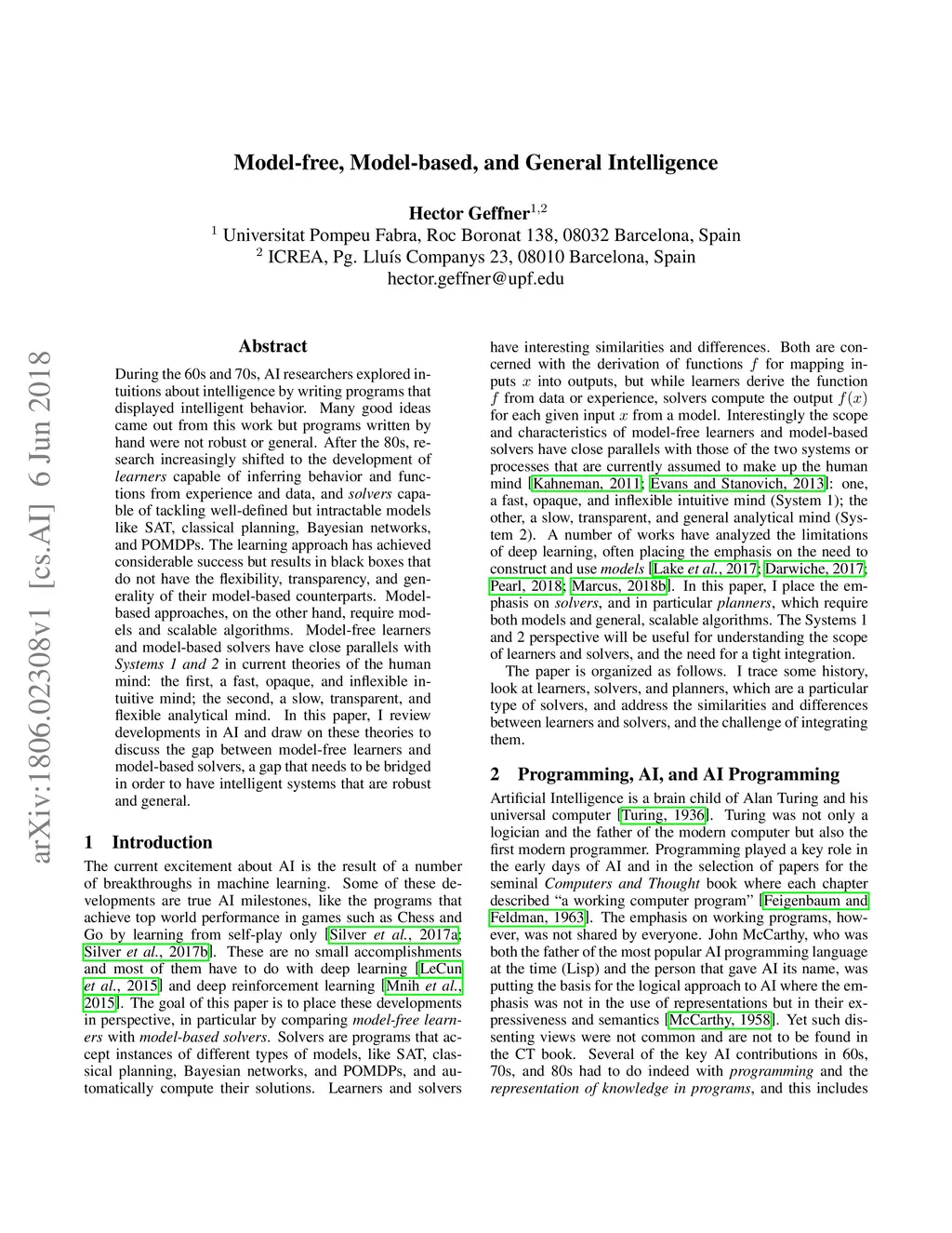 During the 60s and 70s, AI researchers explored intuitions about intelligence by writing programs that displayed intelligent behavior. Many good ideas came out from this work but programs written by hand were not robust or general. After the 80s, research increasingly shifted to the development of learners capable of inferring behavior and functions from experience and data, and solvers capable of tackling well-defined but intractable models like SAT, classical planning, Bayesian networks, and POMDPs. The learning approach has achieved considerable success but results in black boxes that do not have the flexibility, transparency, and generality of their model-based counterparts. Model-based approaches, on the other hand, require models and scalable algorithms. Model-free learners and model-based solvers have close parallels with Systems 1 and 2 in current theories of the human mind: the first, a fast, opaque, and inflexible intuitive mind; the second, a slow, transparent, and flexible analytical mind. In this paper, I review developments in AI and draw on these theories to discuss the gap between model-free learners and model-based solvers, a gap that needs to be bridged in order to have intelligent systems that are robust and general.