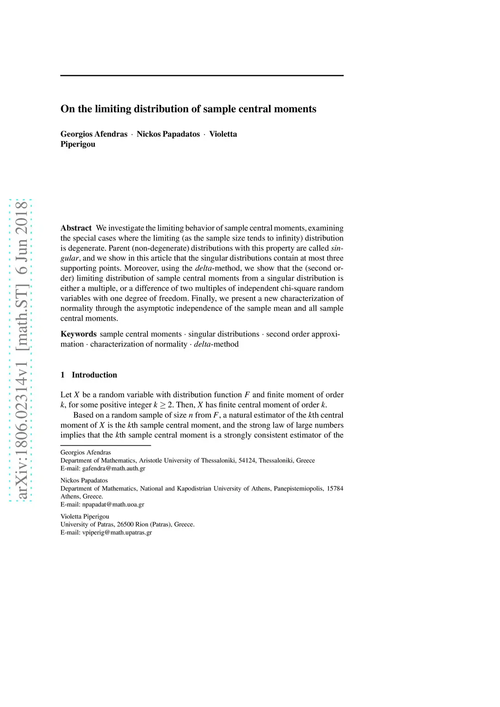 We investigate the limiting behavior of sample central moments, examining the special cases where the limiting (as the sample size tends to infinity) distribution is degenerate. Parent (non-degenerate) distributions with this property are called \emph{singular}, and we show in this article that the singular distributions contain at most three supporting points. Moreover, using the \emph{delta}-method, we show that the (second order) limiting distribution of sample central moments from a singular distribution is either a multiple, or a difference of two multiples of independent chi-square random variables with one degree of freedom. Finally, we present a new characterization of normality through the asymptotic independence of the sample mean and all sample central moments.