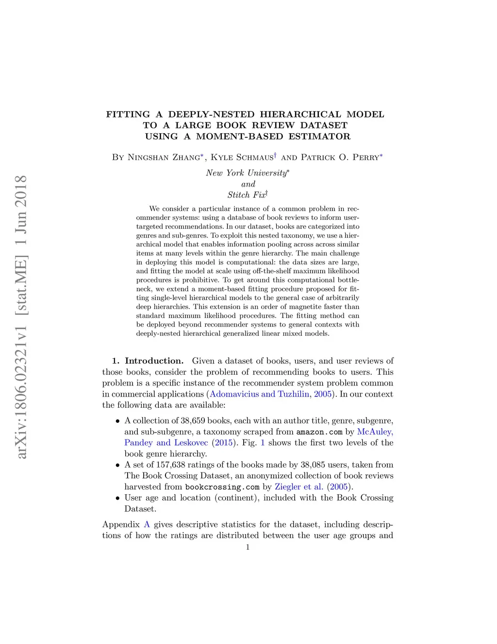 We consider a particular instance of a common problem in recommender systems: using a database of book reviews to inform user-targeted recommendations. In our dataset, books are categorized into genres and sub-genres. To exploit this nested taxonomy, we use a hierarchical model that enables information pooling across across similar items at many levels within the genre hierarchy. The main challenge in deploying this model is computational: the data sizes are large, and fitting the model at scale using off-the-shelf maximum likelihood procedures is prohibitive. To get around this computational bottleneck, we extend a moment-based fitting procedure proposed for fitting single-level hierarchical models to the general case of arbitrarily deep hierarchies. This extension is an order of magnetite faster than standard maximum likelihood procedures. The fitting method can be deployed beyond recommender systems to general contexts with deeply-nested hierarchical generalized linear mixed models.