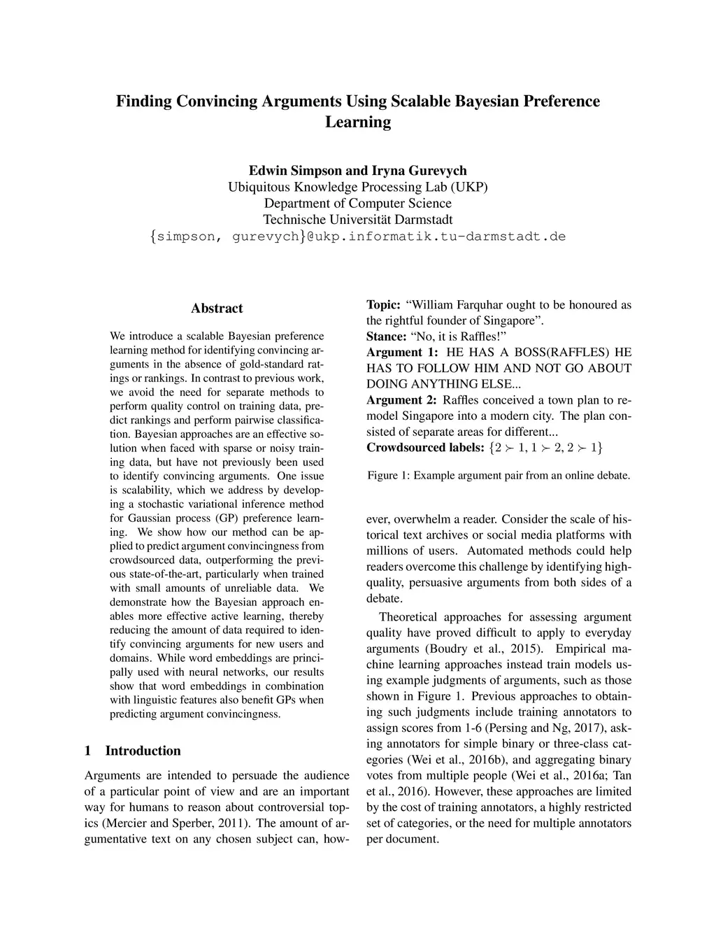We introduce a scalable Bayesian preference learning method for identifying convincing arguments in the absence of gold-standard rat- ings or rankings. In contrast to previous work, we avoid the need for separate methods to perform quality control on training data, predict rankings and perform pairwise classification. Bayesian approaches are an effective solution when faced with sparse or noisy training data, but have not previously been used to identify convincing arguments. One issue is scalability, which we address by developing a stochastic variational inference method for Gaussian process (GP) preference learning. We show how our method can be applied to predict argument convincingness from crowdsourced data, outperforming the previous state-of-the-art, particularly when trained with small amounts of unreliable data. We demonstrate how the Bayesian approach enables more effective active learning, thereby reducing the amount of data required to identify convincing arguments for new users and domains. While word embeddings are principally used with neural networks, our results show that word embeddings in combination with linguistic features also benefit GPs when predicting argument convincingness.