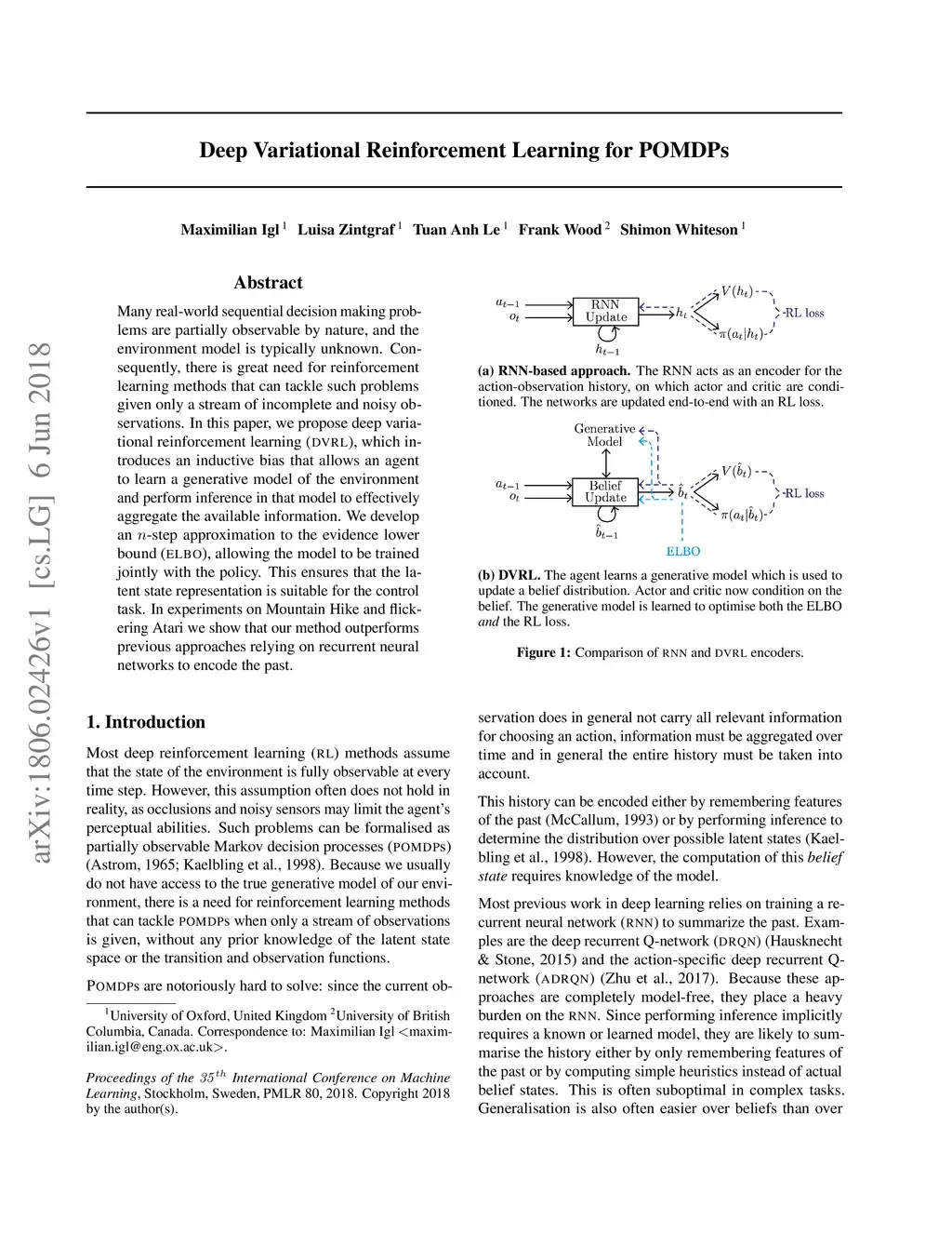 Many real-world sequential decision making problems are partially observable by nature, and the environment model is typically unknown. Consequently, there is great need for reinforcement learning methods that can tackle such problems given only a stream of incomplete and noisy observations. In this paper, we propose deep variational reinforcement learning (DVRL), which introduces an inductive bias that allows an agent to learn a generative model of the environment and perform inference in that model to effectively aggregate the available information. We develop an n-step approximation to the evidence lower bound (ELBO), allowing the model to be trained jointly with the policy. This ensures that the latent state representation is suitable for the control task. In experiments on Mountain Hike and flickering Atari we show that our method outperforms previous approaches relying on recurrent neural networks to encode the past.
