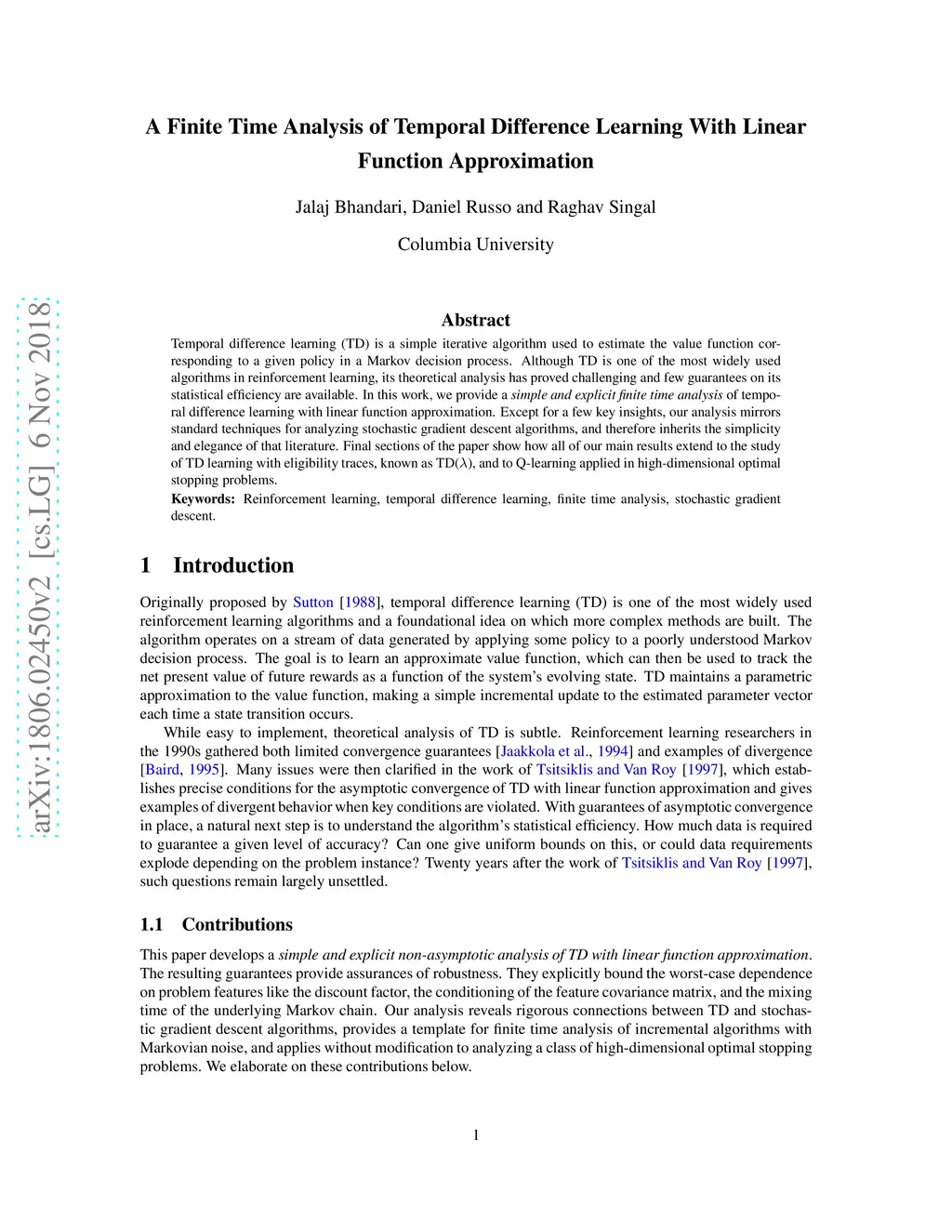 Temporal difference learning (TD) is a simple iterative algorithm used to estimate the value function corresponding to a given policy in a Markov decision process. Although TD is one of the most widely used algorithms in reinforcement learning, its theoretical analysis has proved challenging and few guarantees on its statistical efficiency are available. In this work, we provide a simple and explicit finite time analysis of temporal difference learning with linear function approximation. Except for a few key insights, our analysis mirrors standard techniques for analyzing stochastic gradient descent algorithms, and therefore inherits the simplicity and elegance of that literature. Final sections of the paper show how all of our main results extend to the study of TD learning with eligibility traces, known as TD(), and to Q-learning applied in high-dimensional optimal stopping problems.
