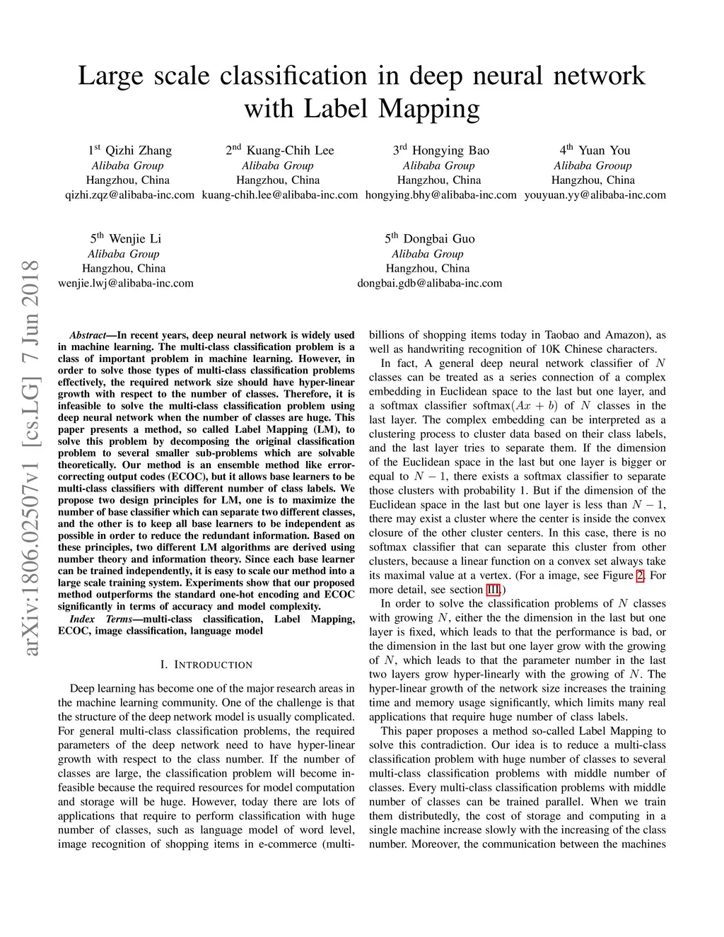 In recent years, deep neural network is widely used in machine learning. The multi-class classification problem is a class of important problem in machine learning. However, in order to solve those types of multi-class classification problems effectively, the required network size should have hyper-linear growth with respect to the number of classes. Therefore, it is infeasible to solve the multi-class classification problem using deep neural network when the number of classes are huge. This paper presents a method, so called Label Mapping (LM), to solve this problem by decomposing the original classification problem to several smaller sub-problems which are solvable theoretically. Our method is an ensemble method like error-correcting output codes (ECOC), but it allows base learners to be multi-class classifiers with different number of class labels. We propose two design principles for LM, one is to maximize the number of base classifier which can separate two different classes, and the other is to keep all base learners to be independent as possible in order to reduce the redundant information. Based on these principles, two different LM algorithms are derived using number theory and information theory. Since each base learner can be trained independently, it is easy to scale our method into a large scale training system. Experiments show that our proposed method outperforms the standard one-hot encoding and ECOC significantly in terms of accuracy and model complexity.