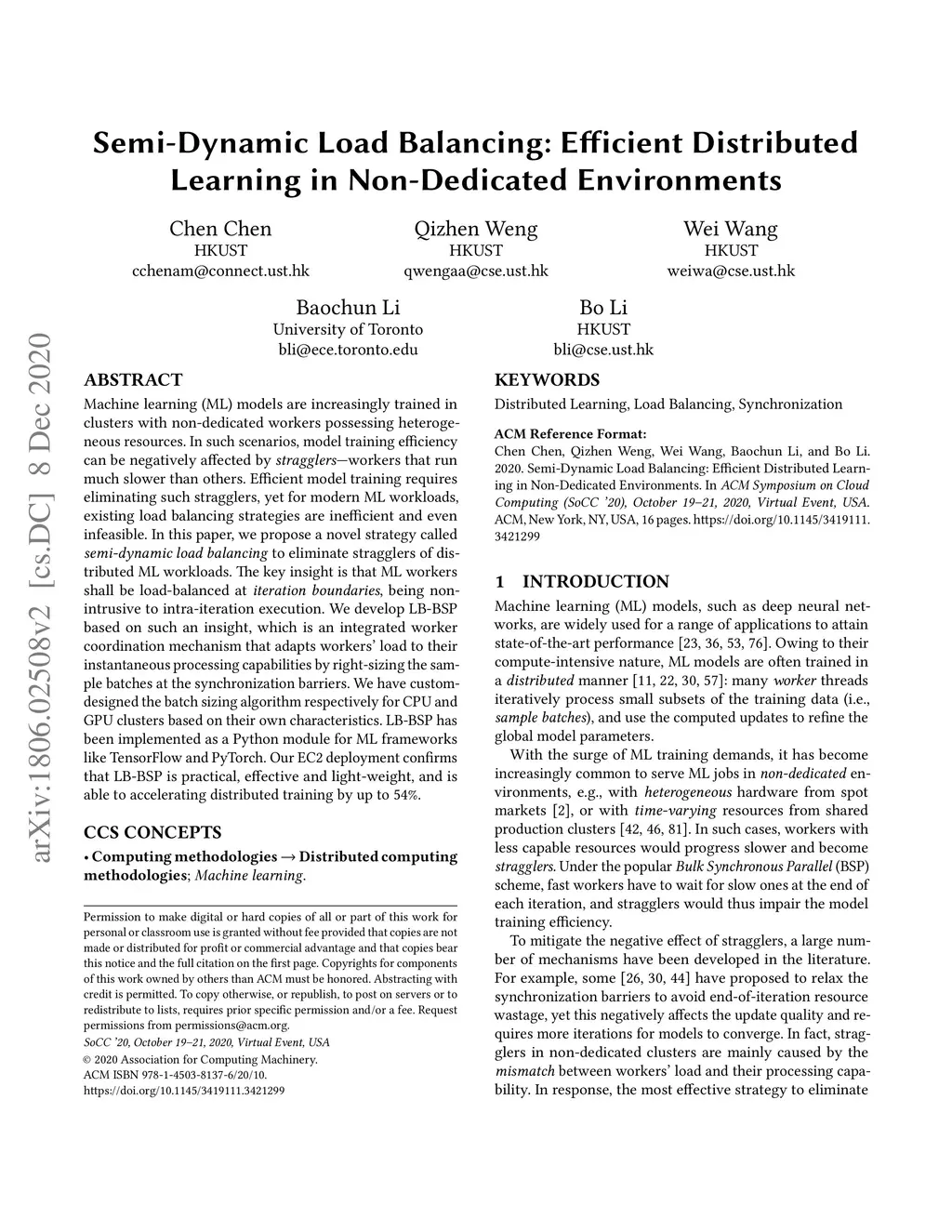 Machine learning (ML) models are increasingly trained in clusters with non-dedicated workers possessing heterogeneous resources. In such scenarios, model training efficiency can be negatively affected by stragglers -- workers that run much slower than others. Efficient model training requires eliminating such stragglers, yet for modern ML workloads, existing load balancing strategies are inefficient and even infeasible. In this paper, we propose a novel strategy called semi-dynamic load balancing to eliminate stragglers of distributed ML workloads. The key insight is that ML workers shall be load-balanced at iteration boundaries, being non-intrusive to intra-iteration execution. We develop LB-BSP based on such an insight, which is an integrated worker coordination mechanism that adapts workers' load to their instantaneous processing capabilities by right-sizing the sample batches at the synchronization barriers. We have custom-designed the batch sizing algorithm respectively for CPU and GPU clusters based on their own characteristics. LB-BSP has been implemented as a Python module for ML frameworks like TensorFlow and PyTorch. Our EC2 deployment confirms that LB-BSP is practical, effective and light-weight, and is able to accelerating distributed training by up to .
