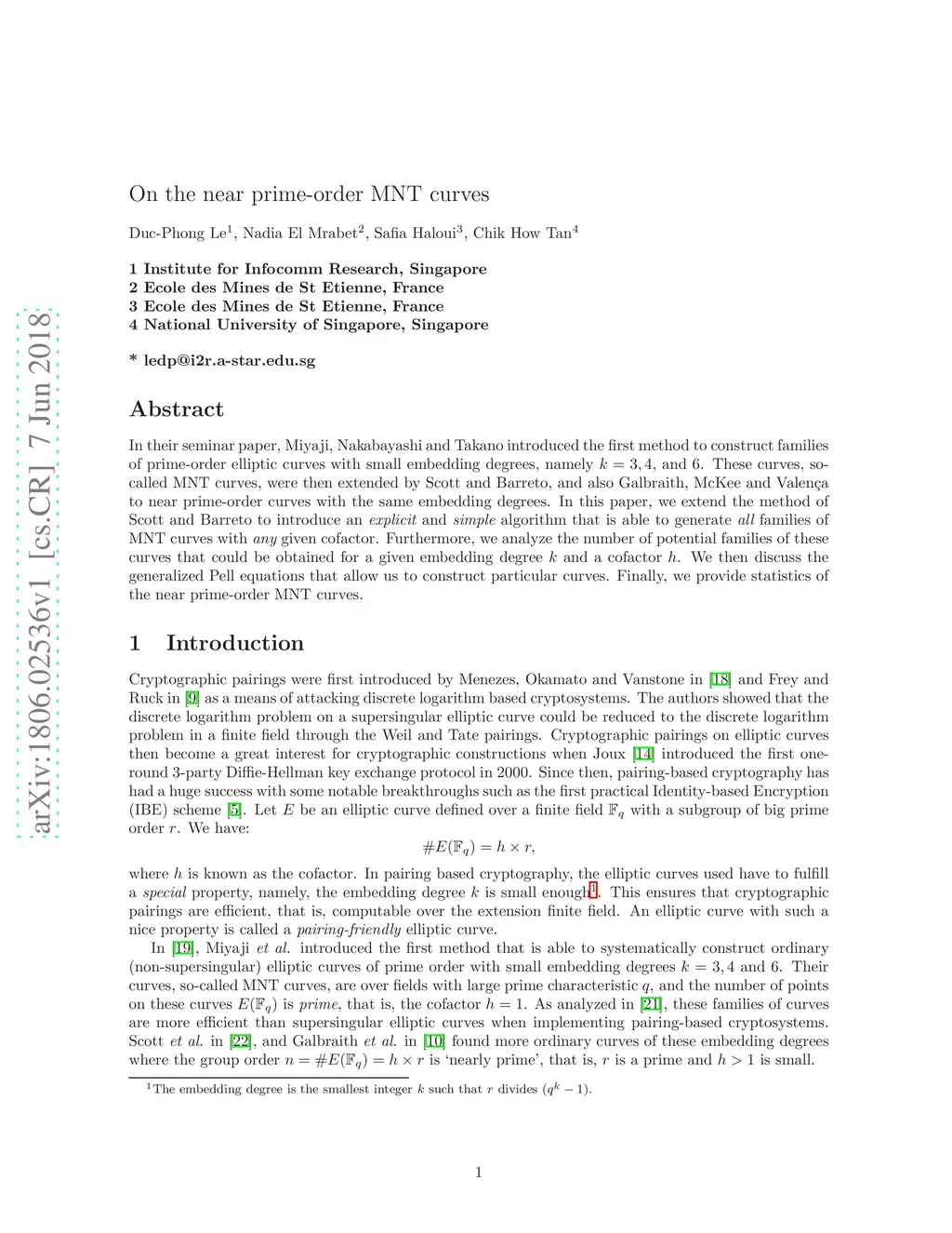 In their seminar paper, Miyaji, Nakabayashi and Takano introduced the first method to construct families of prime-order elliptic curves with small embedding degrees, namely k = 3, 4, and 6. These curves, so-called MNT curves, were then extended by Scott and Barreto, and also Galbraith, McKee and Valenca to near prime-order curves with the same embedding degrees. In this paper, we extend the method of Scott and Barreto to introduce an explicit and simple algorithm that is able to generate all families of MNT curves with any given cofactor. Furthermore, we analyze the number of potential families of these curves that could be obtained for a given embedding degree and a cofactor h. We then discuss the generalized Pell equations that allow us to construct particular curves. Finally, we provide statistics of the near prime-order MNT curves.