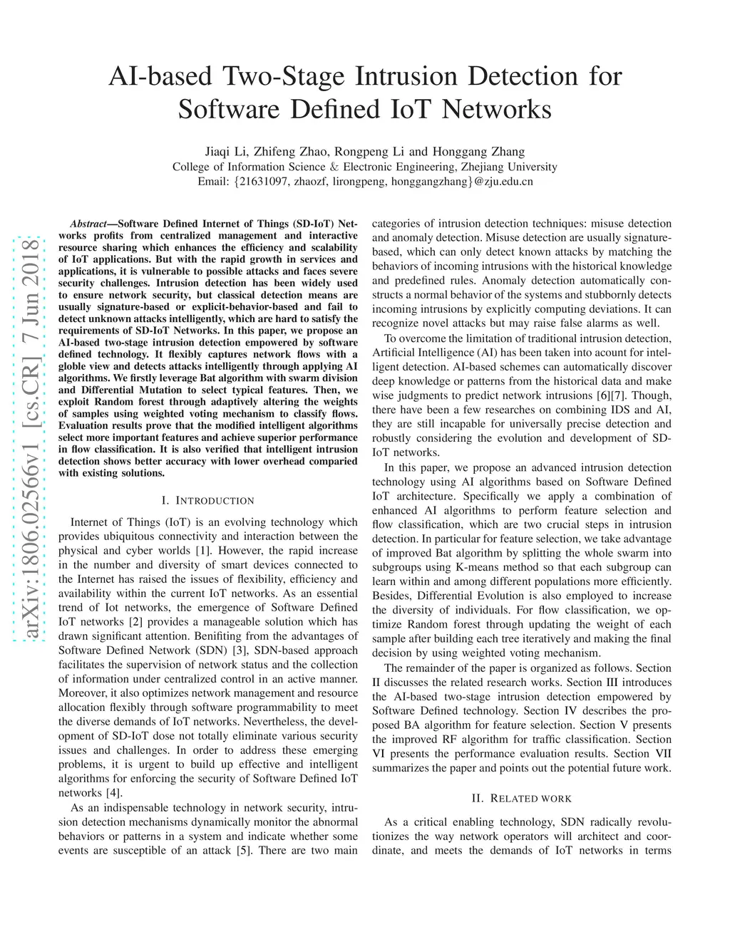 AI-based Two-Stage Intrusion Detection for Software Defined IoT Networks