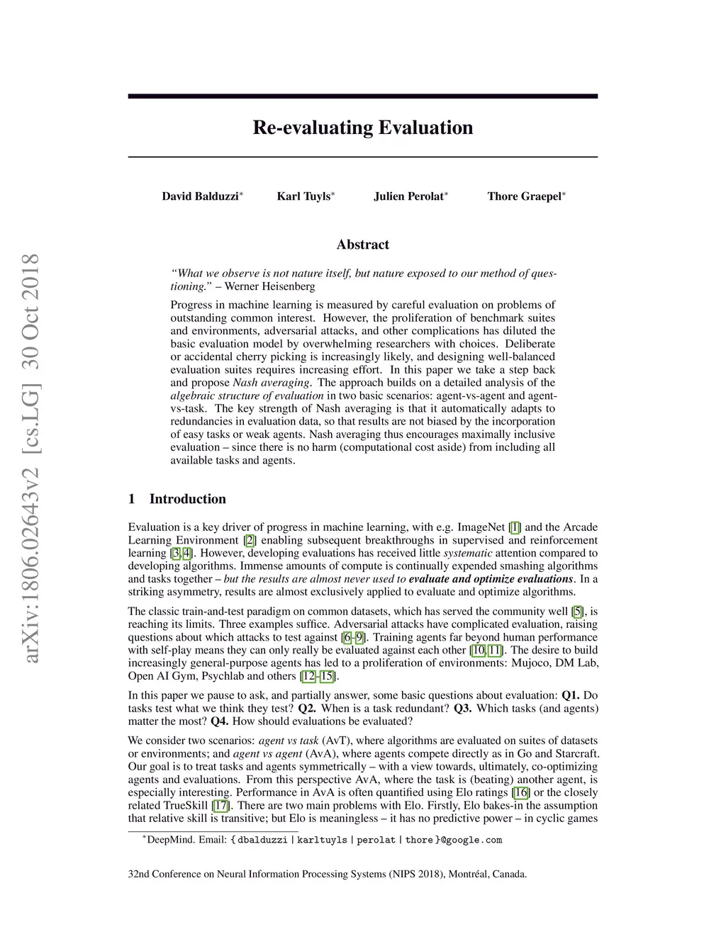 Progress in machine learning is measured by careful evaluation on problems of outstanding common interest. However, the proliferation of benchmark suites and environments, adversarial attacks, and other complications has diluted the basic evaluation model by overwhelming researchers with choices. Deliberate or accidental cherry picking is increasingly likely, and designing well-balanced evaluation suites requires increasing effort. In this paper we take a step back and propose Nash averaging. The approach builds on a detailed analysis of the algebraic structure of evaluation in two basic scenarios: agent-vs-agent and agent-vs-task. The key strength of Nash averaging is that it automatically adapts to redundancies in evaluation data, so that results are not biased by the incorporation of easy tasks or weak agents. Nash averaging thus encourages maximally inclusive evaluation -- since there is no harm (computational cost aside) from including all available tasks and agents.
