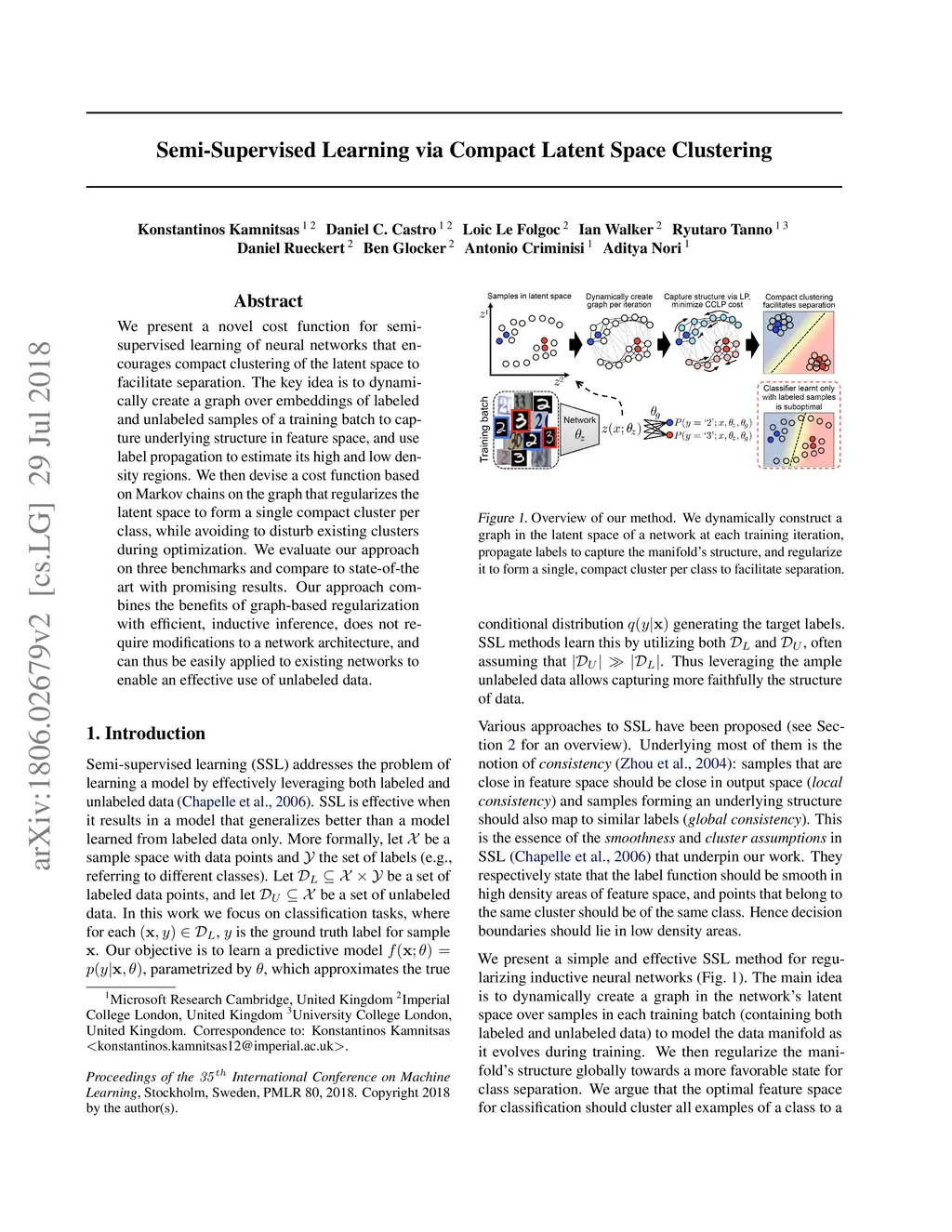 We present a novel cost function for semi-supervised learning of neural networks that encourages compact clustering of the latent space to facilitate separation. The key idea is to dynamically create a graph over embeddings of labeled and unlabeled samples of a training batch to capture underlying structure in feature space, and use label propagation to estimate its high and low density regions. We then devise a cost function based on Markov chains on the graph that regularizes the latent space to form a single compact cluster per class, while avoiding to disturb existing clusters during optimization. We evaluate our approach on three benchmarks and compare to state-of-the art with promising results. Our approach combines the benefits of graph-based regularization with efficient, inductive inference, does not require modifications to a network architecture, and can thus be easily applied to existing networks to enable an effective use of unlabeled data.