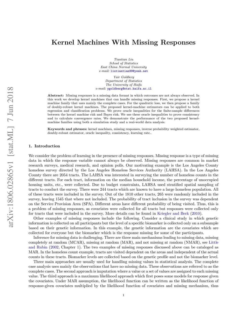 Missing responses is a missing data format in which outcomes are not always observed. In this work we develop kernel machines that can handle missing responses. First, we propose a kernel machine family that uses mainly the complete cases. For the quadratic loss, we then propose a family of doubly-robust kernel machines. The proposed kernel-machine estimators can be applied to both regression and classification problems. We prove oracle inequalities for the finite-sample differences between the kernel machine risk and Bayes risk. We use these oracle inequalities to prove consistency and to calculate convergence rates. We demonstrate the performance of the two proposed kernel machine families using both a simulation study and a real-world data analysis.