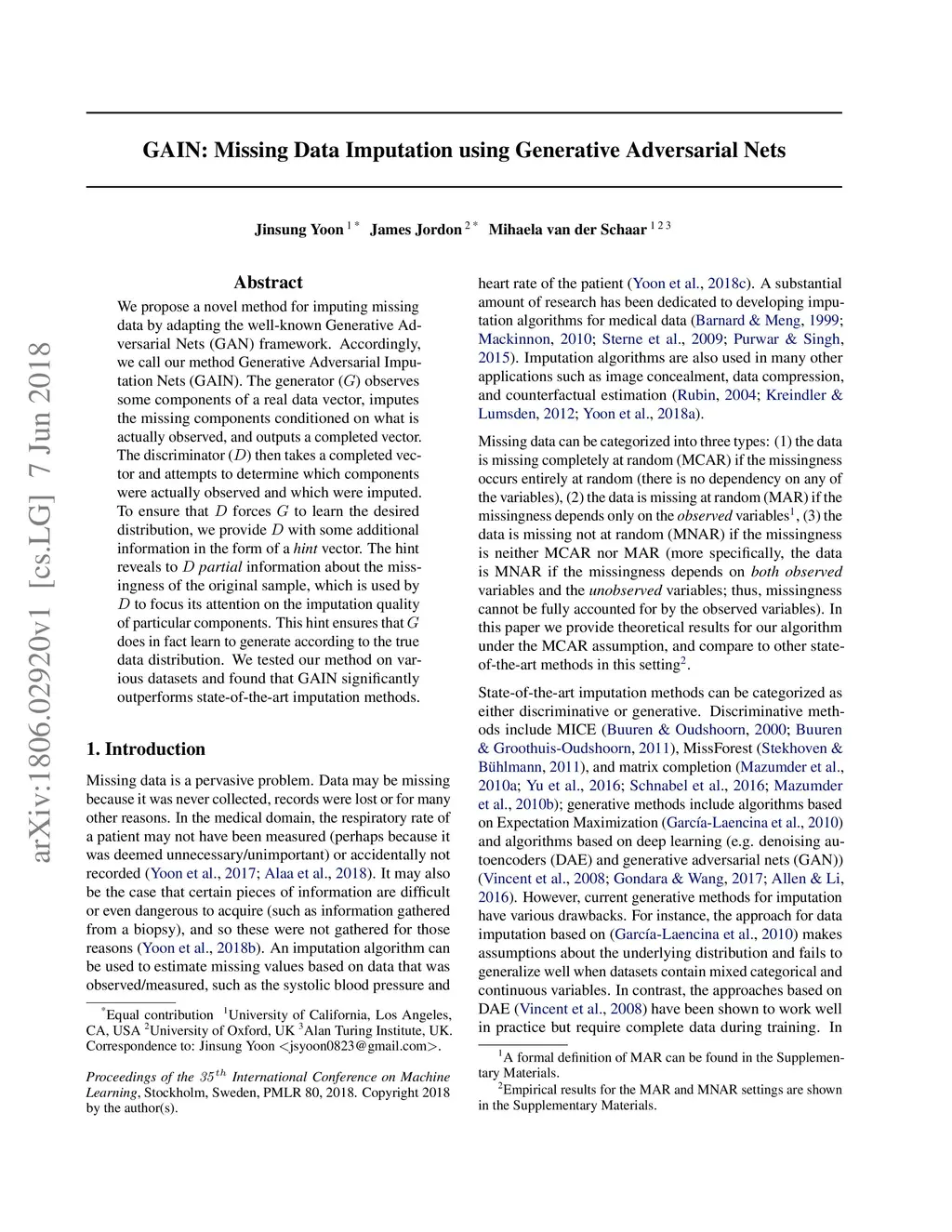 GAIN: Missing Data Imputation using Generative Adversarial Nets