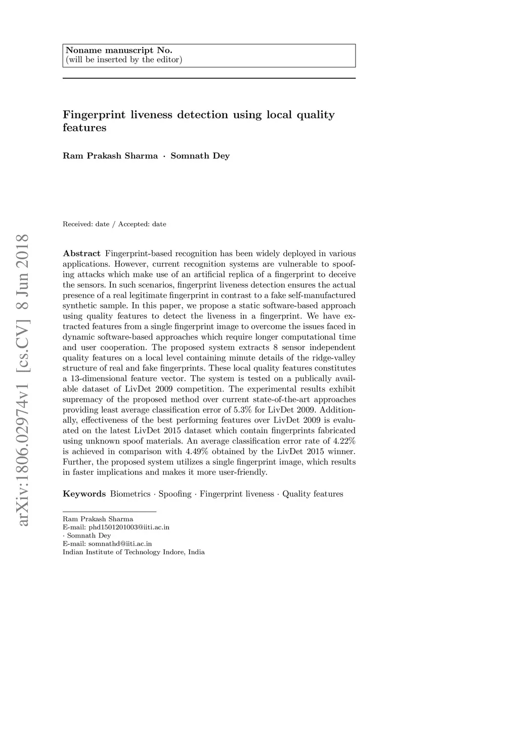Fingerprint liveness detection using local quality features
